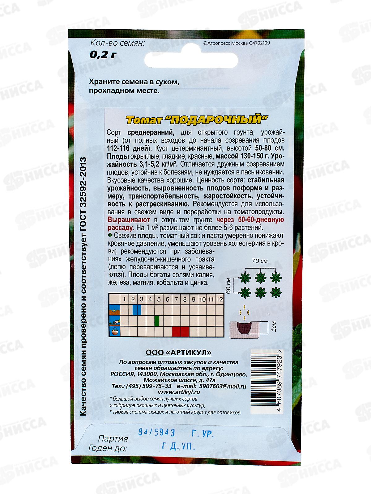 Томат "Подарочный" - сорт среднеранний, для открытого грунта, урожайный (от полных всходов до начала созревания плодов 112-116 дней). Куст детерминантный, высотой 50-80 см. Плоды окрыглые, гладкие, красные, массой 130-150 г. Урожайность 3,1-5,2 кг/м2. Отличается дружным созреванием плодов, устойчив к болезням, не нуждается в пасынковании. Вкусовые качества хорошие. Ценность сорта: стабильная урожайность, выровненность плодов по форме и размеру, транспортабельность, жаростойкость, устойчивость к растрескиванию. Рекомендуется для использования в свежем виде и переработки на томатопродукты Выращивают в открытом грунте через 50-60-дневную рассаду. На 1 м2 размещают не более 5-6 растений. Свежие плоды, томатный сок и паста умеренно понижают кровяное давление, уменьшают уровень холестерина в крови; рекомендуются при заболеваниях желудочно-кишечного тракта (легко перевариваются и усваиваются). Плоды богаты солями калия, железа, магния, кобальта и цинка.