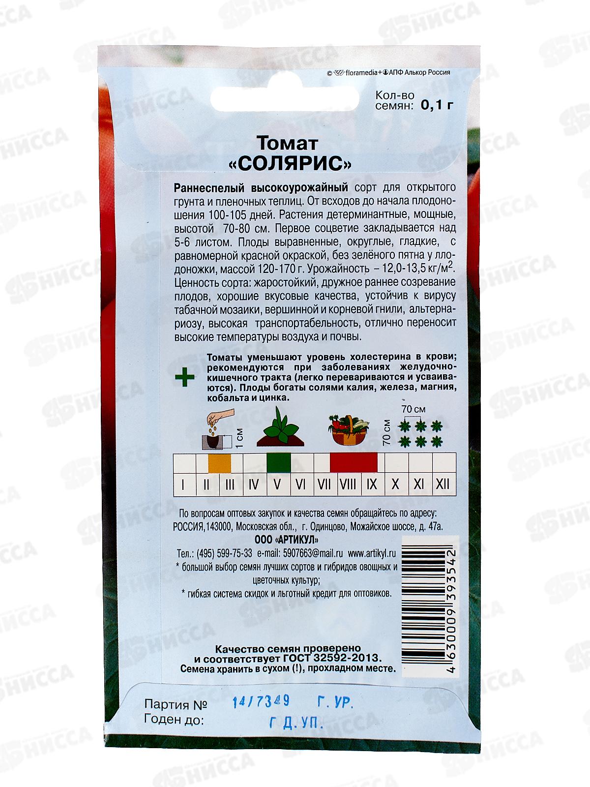 Томат "Солярис" - раннеспелый высокоурожайный сорт для открытого грунта и пленочных теплиц. От всходов до начала плодоношения 100-105 дней. Растения детерминантные, мощные, высотой 70-80 см. Первое соцветие закладывается над 5-6 листом. Плоды выравненные, округлые, гладкие, с равномерной красной окраской, без зелёного пятна у ллодоножки, массой 120-170 г. Урожайность – 12,0-13,5 кг/м2. Ценность сорта: жаростойкий, дружное раннее созревание плодов, хорошие вкусовые качества, устойчив к вирусу табачной мозаики, вершинной и корневой гнили, альтернариозу, высокая транспортабельность, отлично переносит высокие температуры воздуха и почвы. Томаты уменьшают уровень холестерина в крови; рекомендуются при заболеваниях желудочно-кишечного тракта (легко перевариваются и усваиваются). Плоды богаты солями калия, железа, магния, кобальта и цинка.