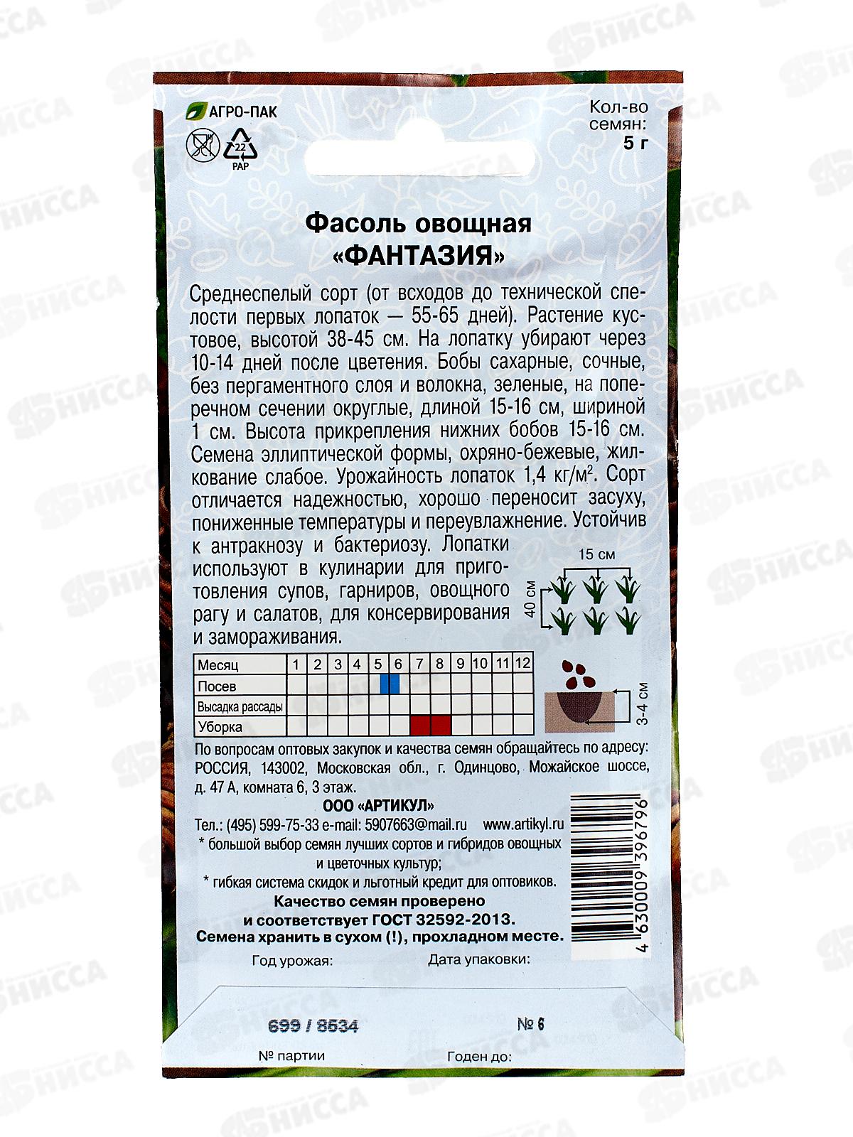 Фасоль овощная "Фантазия" - среднеспелый сорт (от всходов до технической спелости первых лопаток – 55-65 дней). Растение кустовое, высотой 38-45 см. На лопатку убирают через 10-14 дней после цветения. Бобы сахарные, сочные, без пергаментного слоя и волокна, зеленые, на поперечном сечении округлые, длиной 15-16 см, шириной 1 см. Высота прикрепления нижних бобов 15-16 см. Семена эллиптической формы, охряно-бежевые, жилкование слабое. Урожайность лопаток 1,4 кг/м2. Сорт отличается надежностью, хорошо переносит засуху, пониженные температуры и переувлажнение. Устойчив у антракнозу и бактериозу. Лопатки используют в кулинарии для приготовления супов, гарниров, овощного рагу и салатов, для консервирования и замораживания.