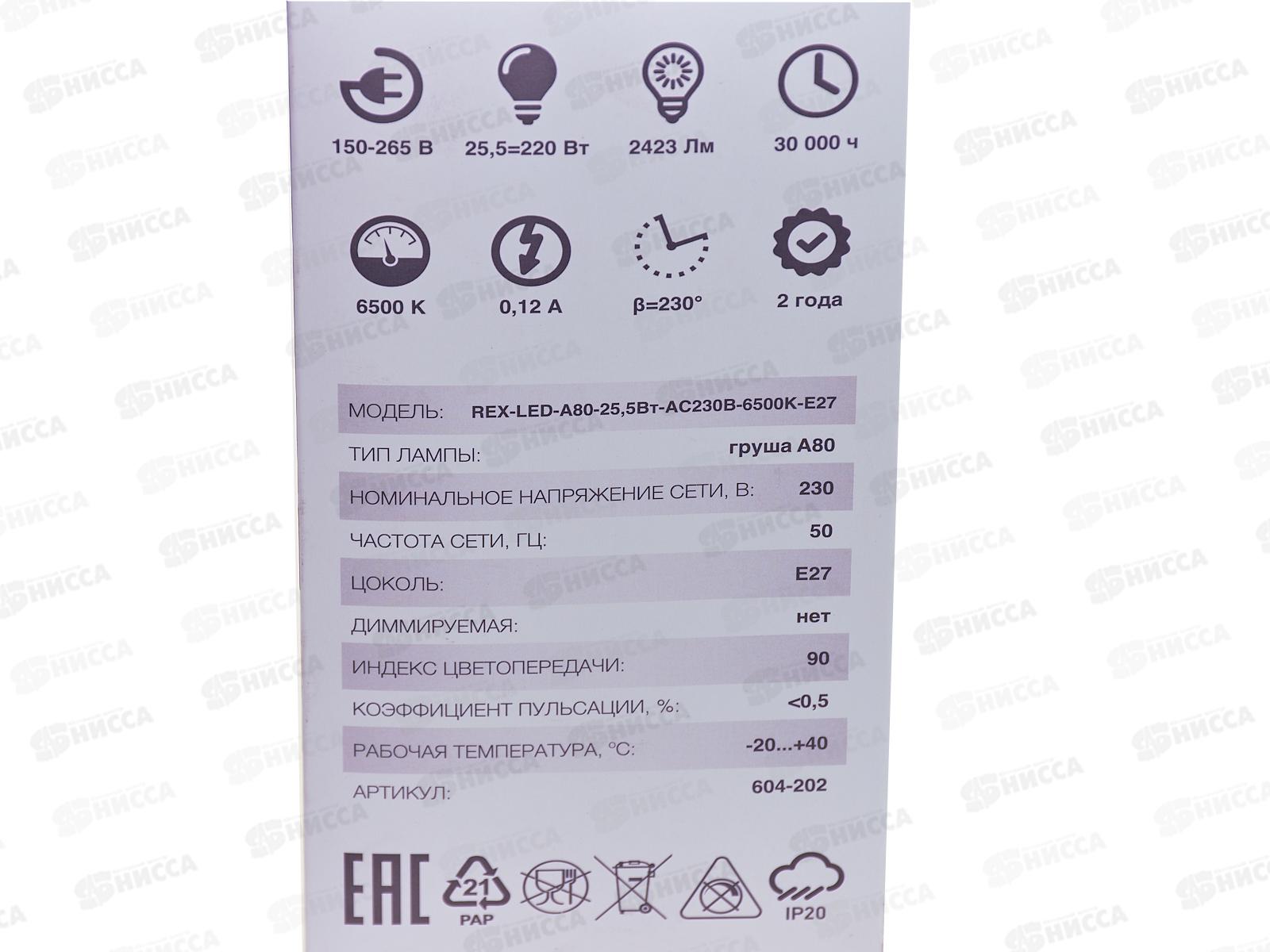 Лампа светодиодная REXANT A80 25,5Вт E27 6500К, 604-202 *5/50