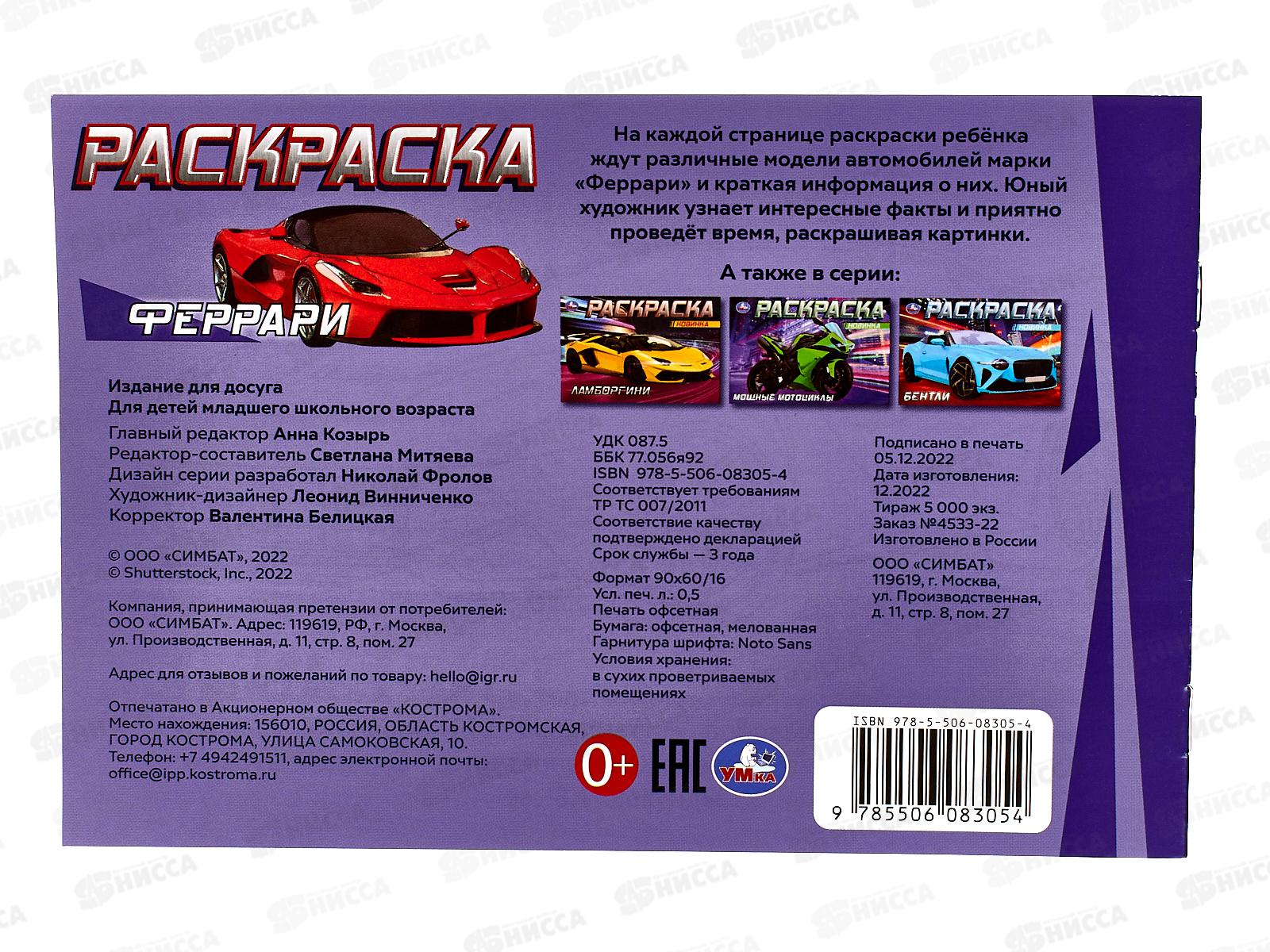 Раскраска "УМКА" 08305-4, Феррари, 210х140мм, 8стр. *50