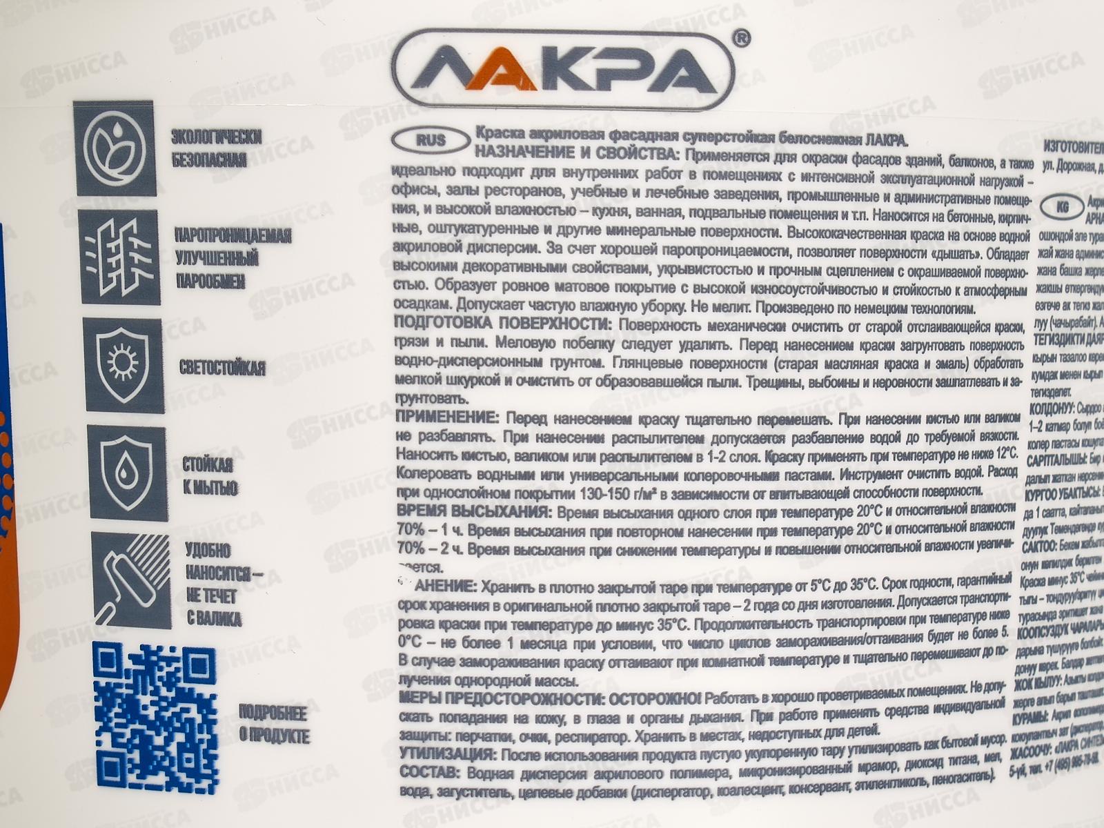 Краска фасадная акриловая суперстойкая 3кг белоснежная Лакра, 8306491 *144