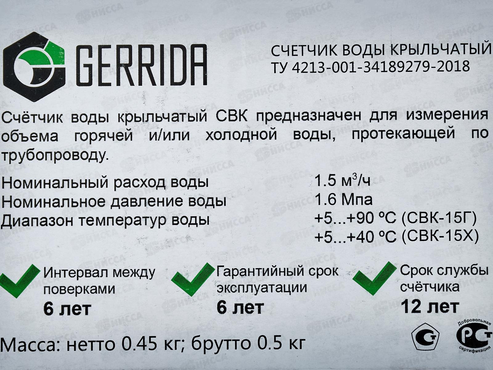 Счетчик воды GERRIDA СВК-15Х для холодной с установочным комплектом, синий *20