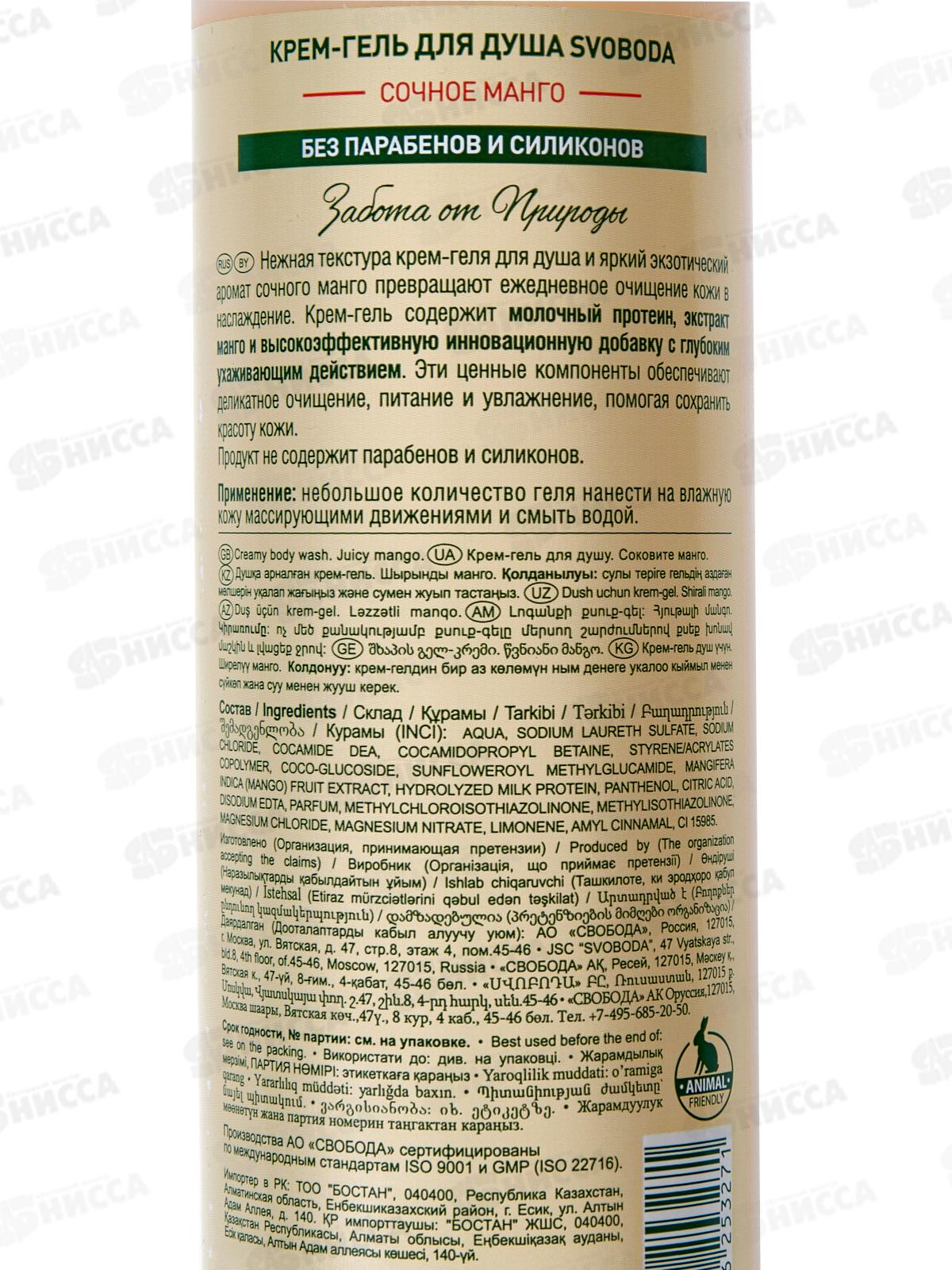 Состав: вода, лауретсульфат натрия, хлорид натрия, кокамид ДЭА, кокамидопропилбетаин, сополимер стирола и акрилатов, кокоглюкозид, метилглюкамид подсолнечника, экстракт плодов манго (Mangifera Indica), гидролизованный молочный белок, пантенол, лимонная кислота, динатриевая ЭДТА, отдушка, метилхлоризотиазолинон, метилизотиазолинон, хлорид магния, нитрат магния, лимонен, амилциннамаль, CI 15985.