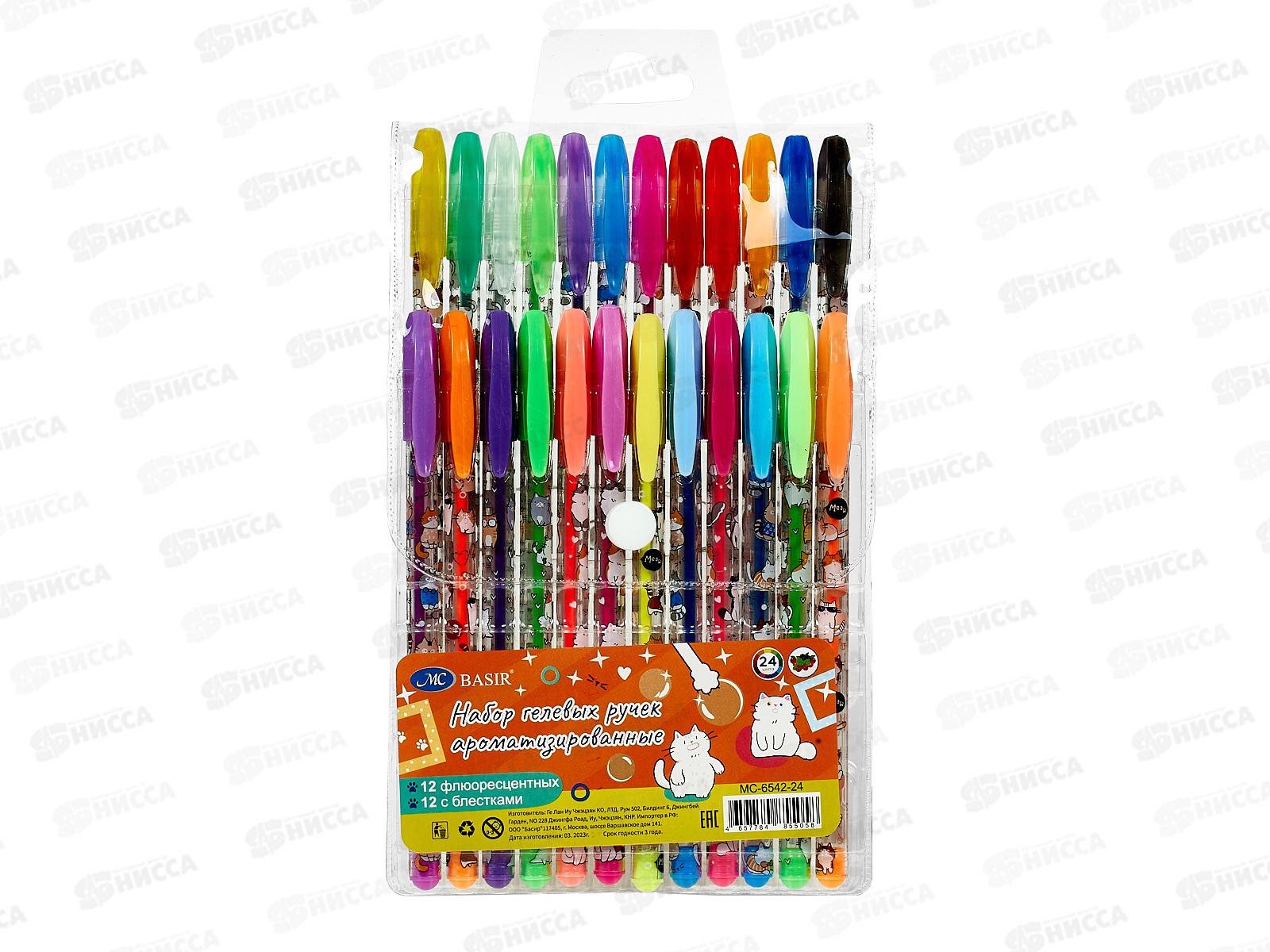 Ручки гелевые BASIR Коты 24 цветов, аромат,с блест.+флуор. МС-6542-24*18