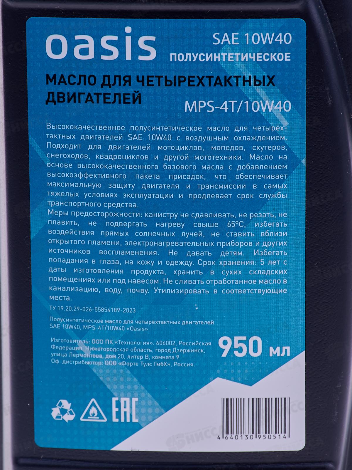 Масло моторное 4-тактное полусинтетическое 0,95л Oasis MPS-4T/10W40