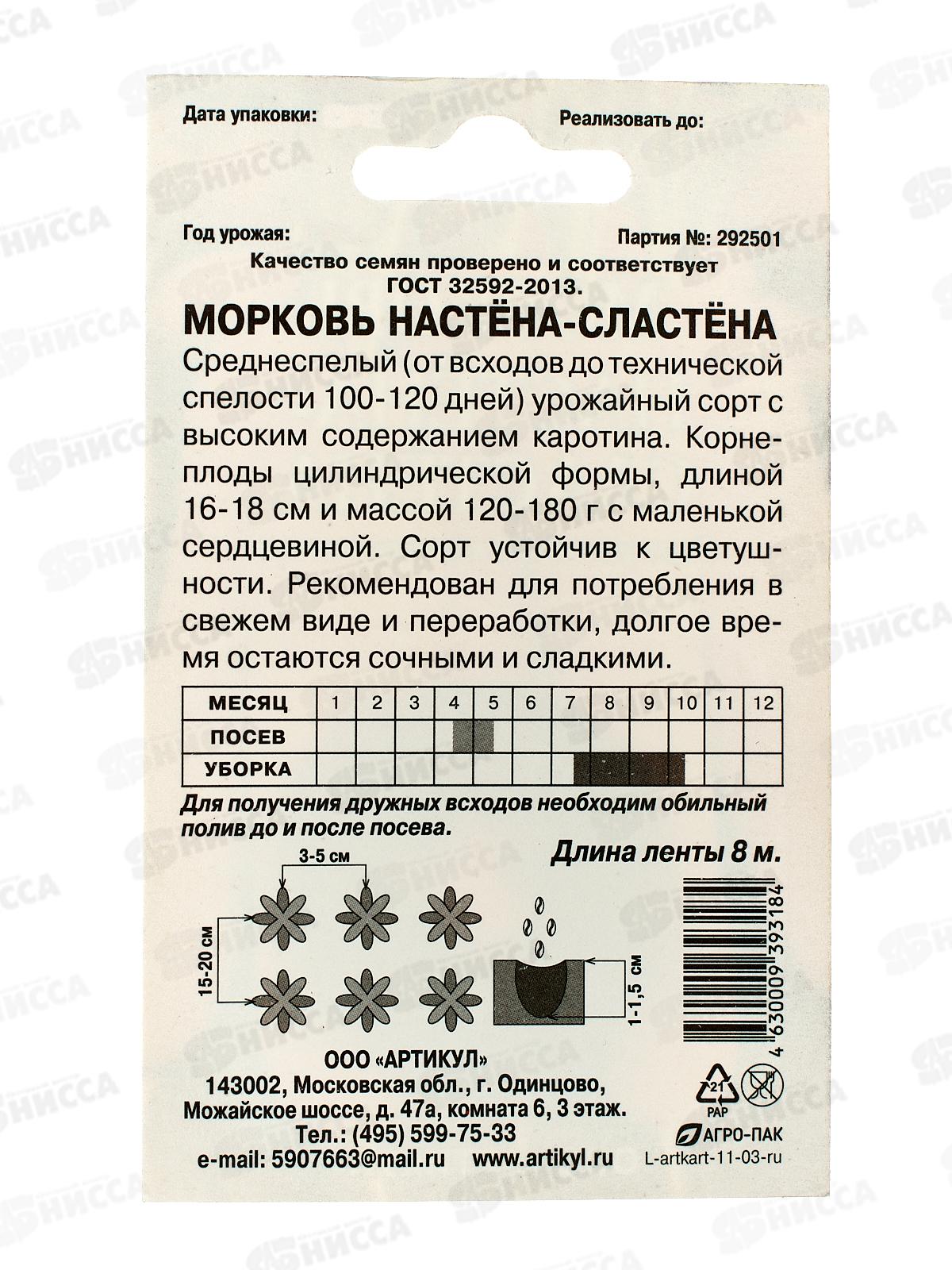 Среднеспелый (от всходов до технической спелости 100-120 дней) урожайный сорт с высоким содержанием каротина. Корнеплоды цилиндрической формы, длинной 16-18см и массой 120-180г с маленькой сердцевиной. Сорт устойчив к цветушности. Рекомендован для потребления в свежем виде и переработки, долгое время остаются сочными и сладкими. Содержит каротин, витамины В1, В2, Р. Морковный сок является лечебным средством, полезен при диетическом питании.