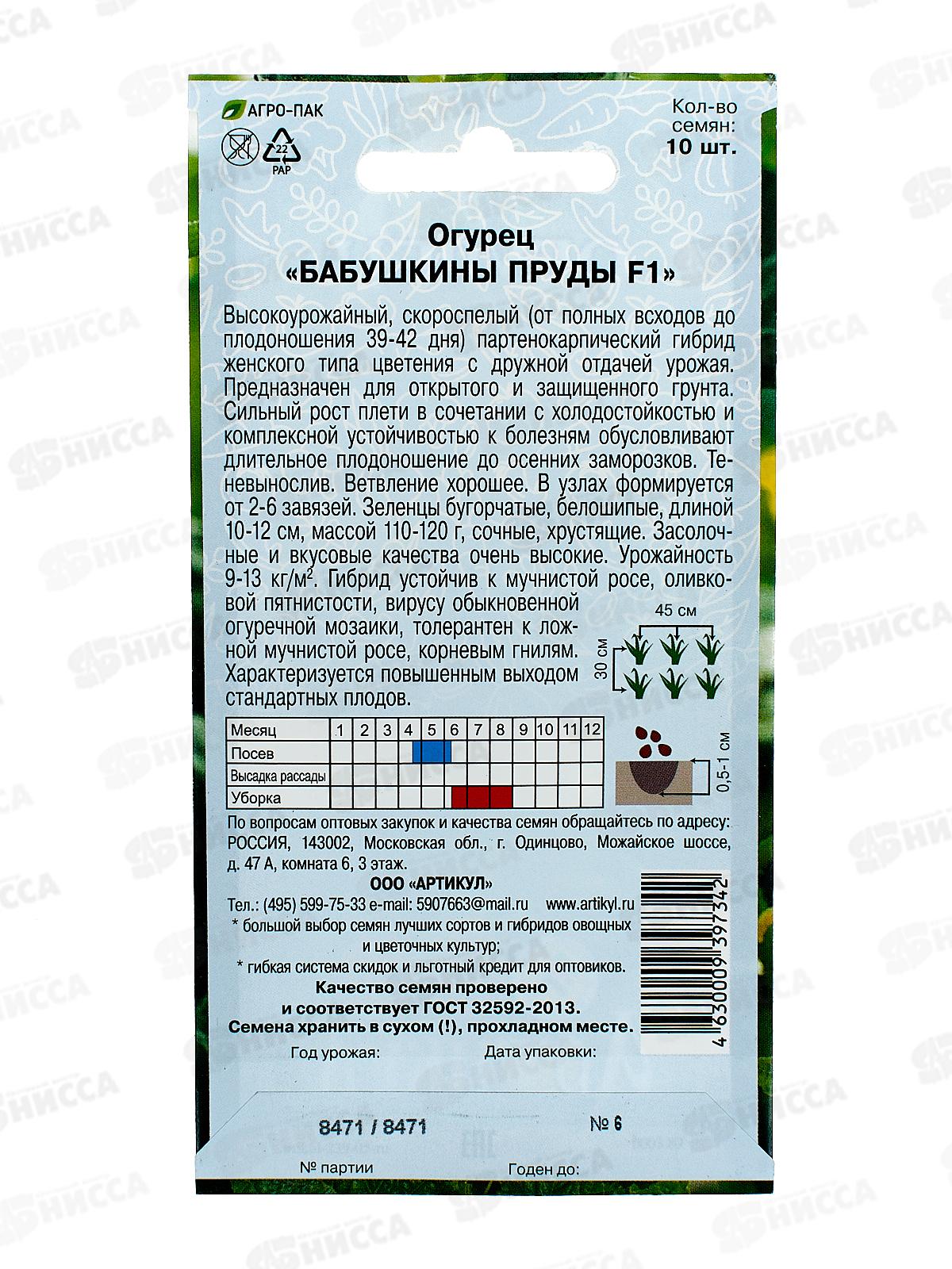 Высокоурожайный, скороспелый (от полных всходов до плодоношения 39-42 дня) партенокарпический гибрид женского типа цветения с дружной отдачей урожая. Предназначен для открытого и защищенного грунта. Сильный рост плети в сочетании с холодостойкостью и комплексной устойчивостью к болезням обусловливают длительное плодоношение до осенних заморозков. Теневынослив. Ветвление хорошее. В узлах формируется от 2-6 завязей. Зеленцы бугорчатые, белошипые, длиной 10-12 см, массой 110-120 г, сочные, хрустящие. Засолочные и вкусовые качества очень высокие. Урожайность 9-13 кг/м2.