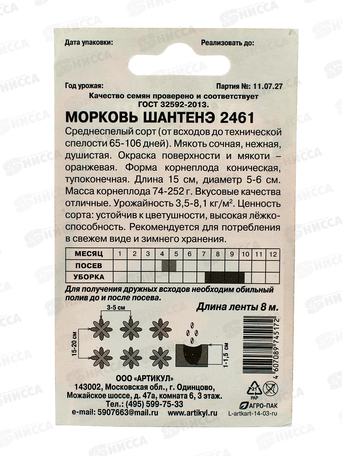 Среднеспелый сорт (период от полных всходов до технической спелости 65-106 дней). Мякоть сочная, нежная, душистая. Окраска поверхности, сердцевины и мякоти корнеплода - оранжевая. Форма корнеплода коническая, тупоконечная. Длина 15 см, диаметр 5,8 см. Корнеплод полностью погружён в почву. Масса корнеплода 74-252 г. Вкусовые качества отличные. Товарная урожайность 3,5-8,1 кг/м2. Ценность сорта: устойчив к цветушности, высокая лёжкоспособность. Рекомендуется для потребления в свежем виде и зимнего хранения. Сок моркови полезен при диетическом питании, болезнях глаз и кожи.
