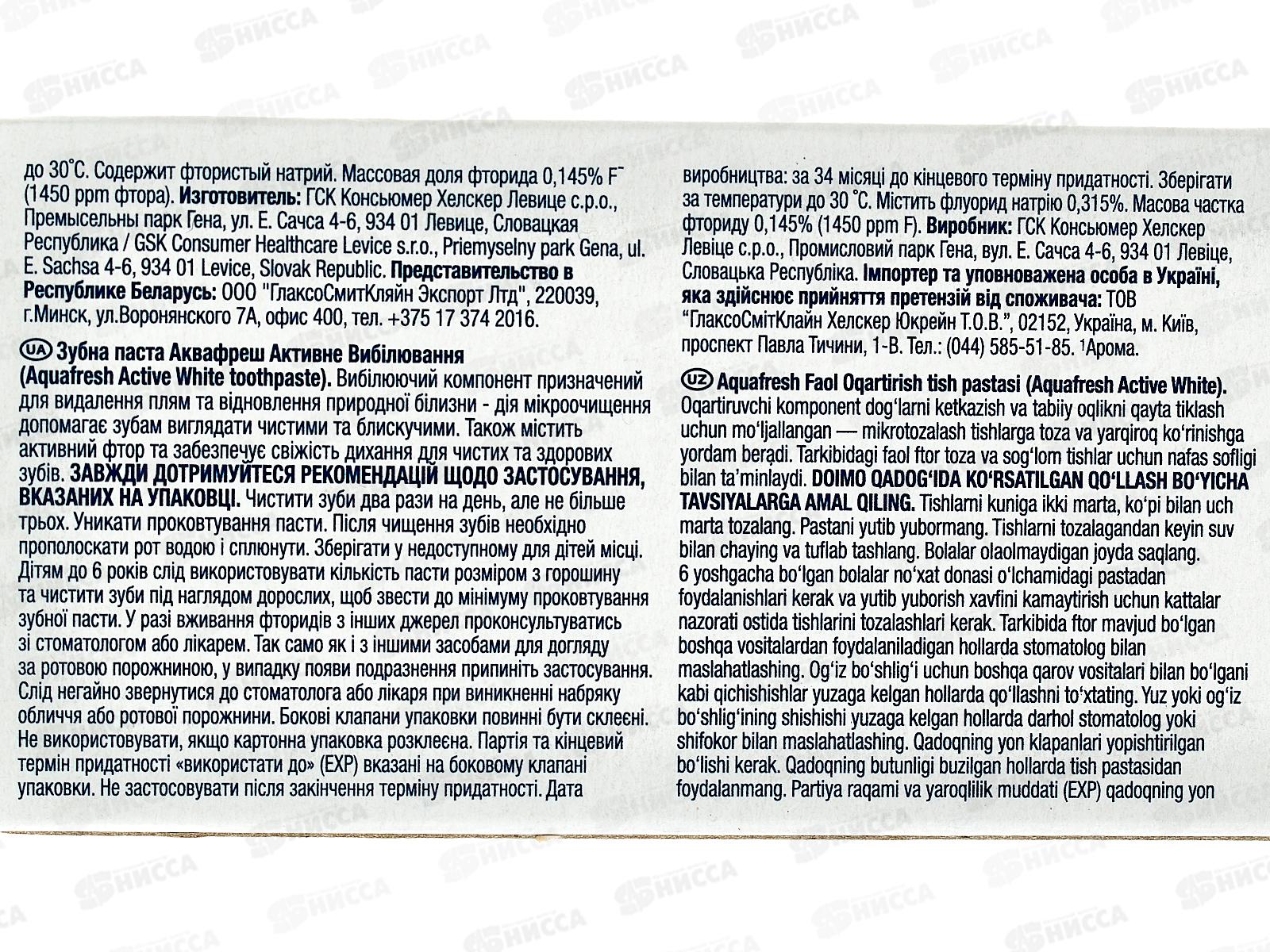 АКВАФРЕШ зубная паста 125мл Активное отбеливание *12