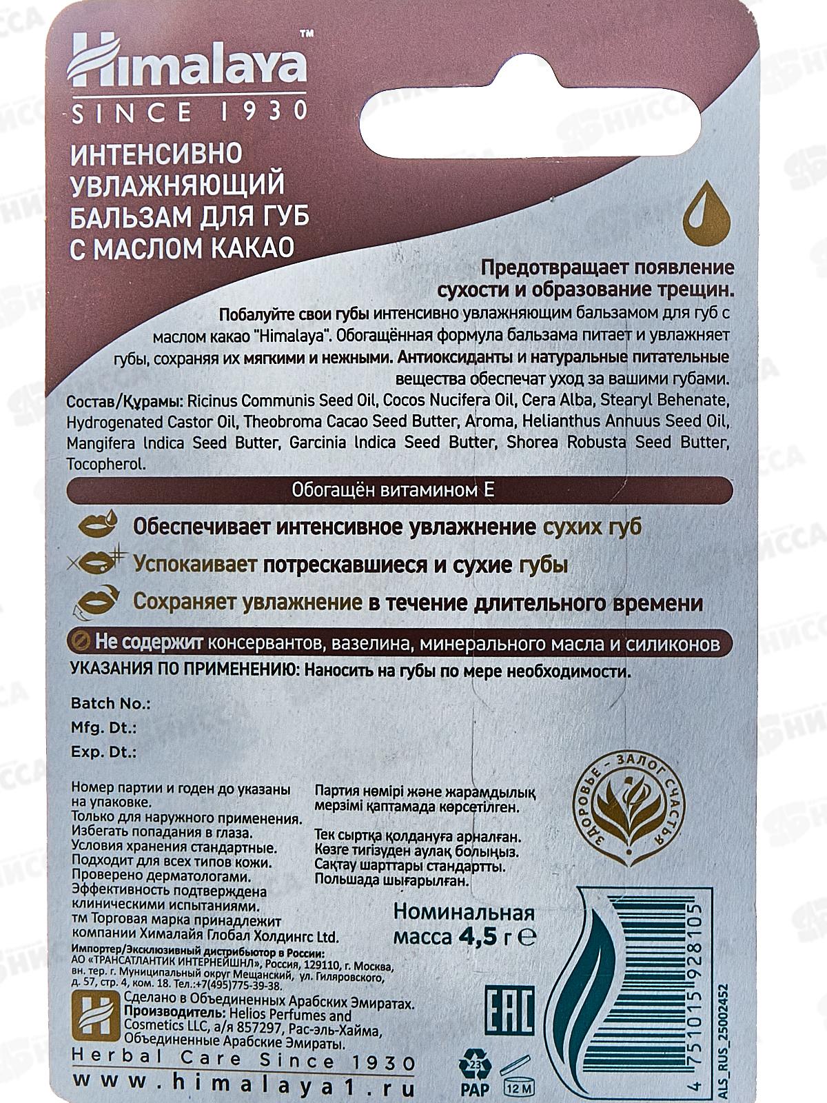 Himalaya since. Бальзам интенсивно увлажняющий для губ с маслом какао, 4,5г, 92810*24