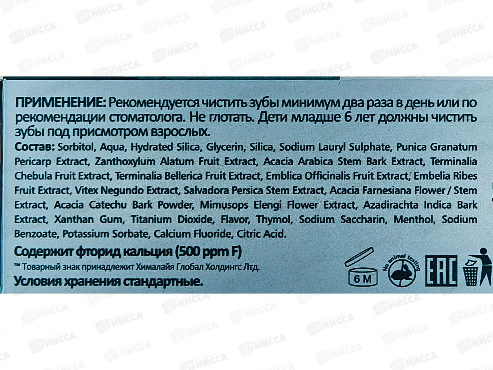 Состав: сорбитол, вода, гидратированный диоксид кремния, глицерин, диоксид кремния, лаурилсульфат натрия, экстракт перикарпия граната, экстракт плодов зантоксилума крылатого, экстракт коры стебля акации арабской, экстракт плодов терминалии хебулы, экстракт плодов терминалии беллерики, экстракт плодов эмблики лекарственной, экстракт плодов эмбелии резинской, экстракт витекса ясенелистного, экстракт стебля сальвадоры персидской, экстракт цветков/стеблей акации фарнезийской, порошок коры акации катеху, экстракт цветков мимусопса эленги, экстракт коры азадирахты индийской, ксантановая камедь, диоксид титана, ароматизатор, тимол, сахаринат натрия, ментол, бензоат натрия, сорбат калия, фторид кальция, лимонная кислота.