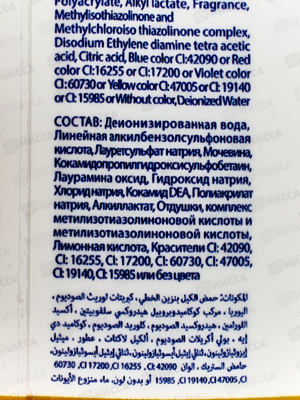 Состав: деионизированная вода, алкилбензолсульфоновая линейная кислота, Лауретсульфат натрия, Мочевина, Кокамидопропилгидроксисульфобетаин, Лаурамина оксид, Гидроксид натрия, Хлорид натрия, Кокамид DEA, Полиакрилат натрия, Алкиллактат, Отдушки, комплекс метилизотиазолиноновой кислоты и метилизотиазолиноновой кислоты, Лимонная кислота, Красители СІ: 42090, СІ: 16255, Cl: 17200, Cl: 60730, Cl: 47005, С: 19140, 15985 или без цвета.