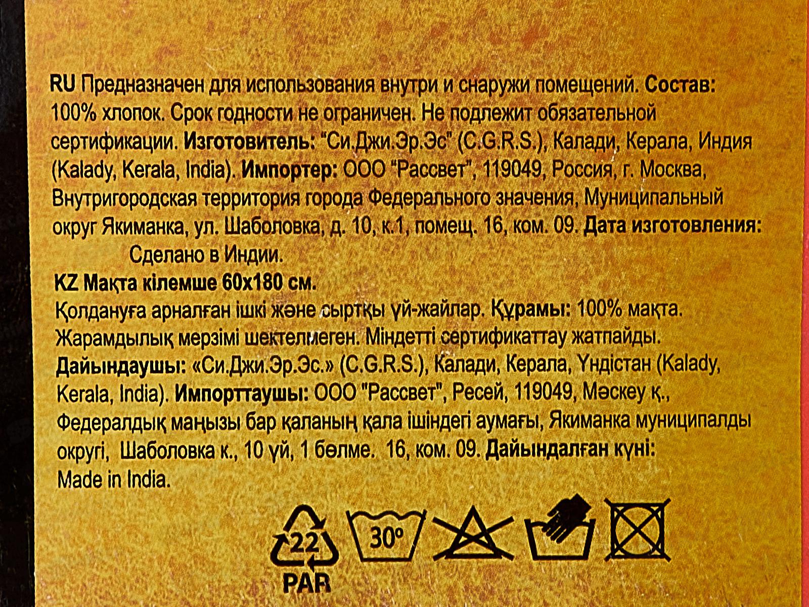 Коврик хлопковый 60*180см SUNSTER 33-156