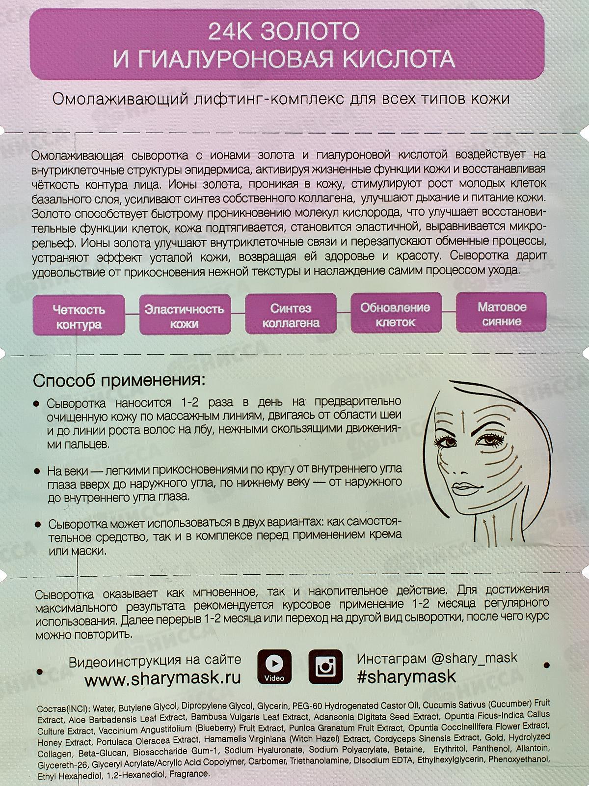 Активные компоненты: 24К золото, гиалуроновая кислота
