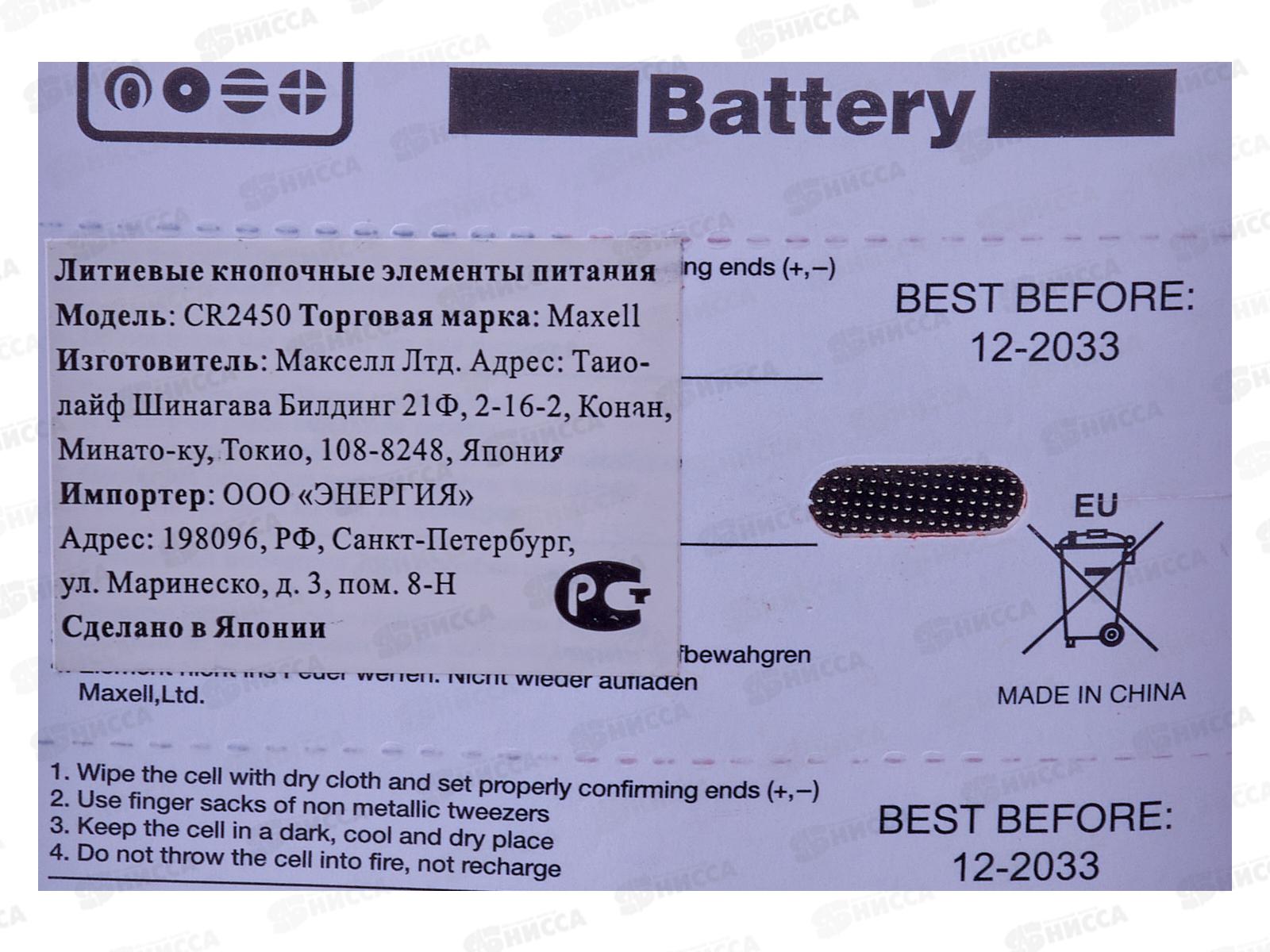 Элемент питания CR2450 Maxell Lithium 3В используется в часах, пультах сигнализации, калькуляторах и других электронных устройствах.