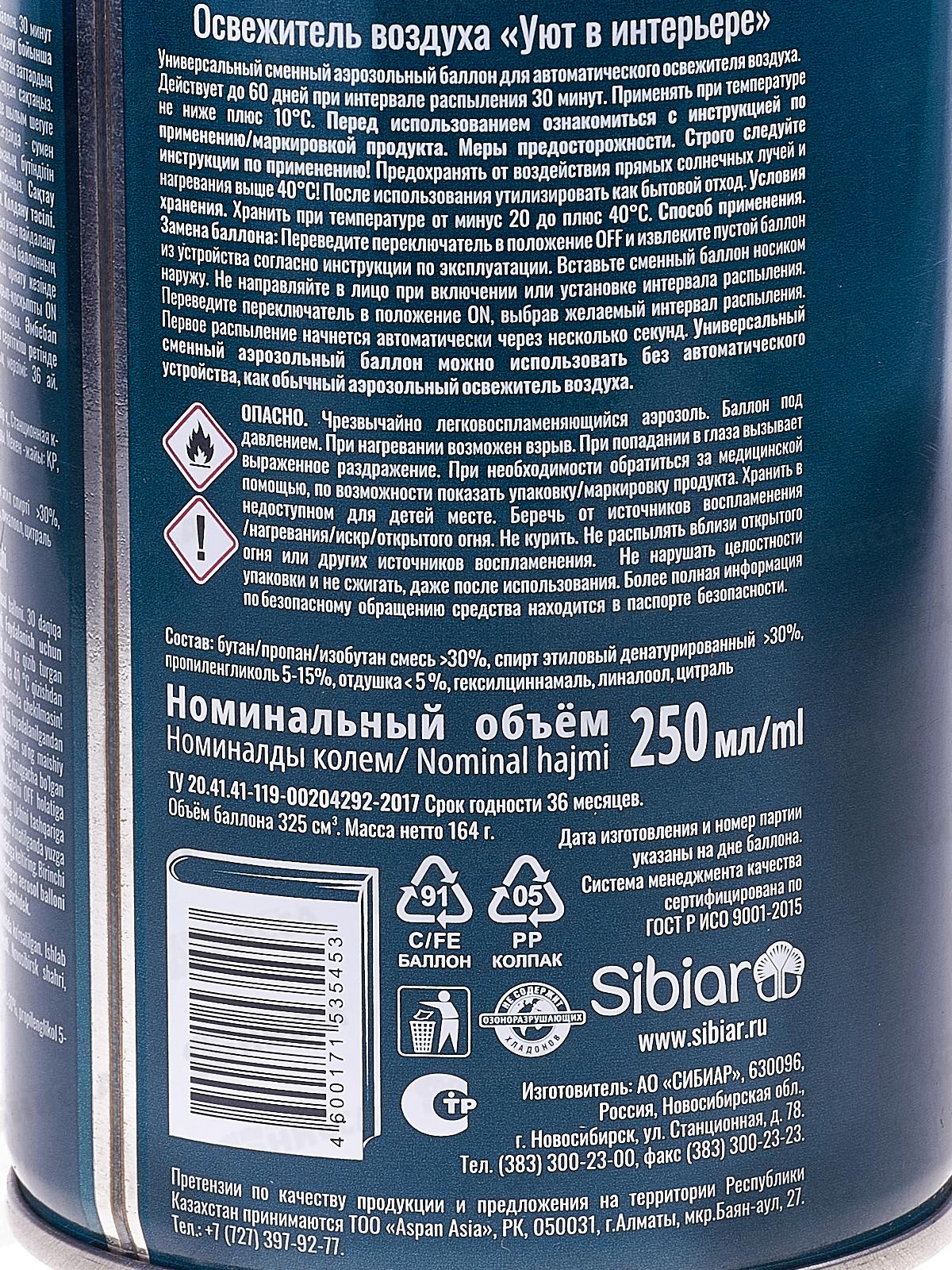Состав: бутан/пропан/изобутан смесь >30%, спирт этиловый денатурированный >30%, пропиленгликоль 5-15%, отдушка <5%, гексилциннамаль, линалоол, цитраль.