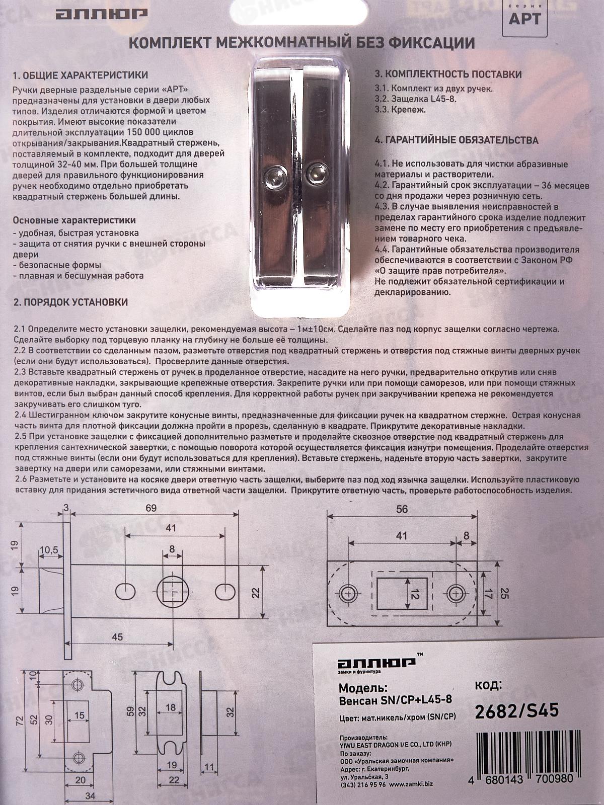 Комплект: ручка на квадратной накладке и защелка без фиксации. Материал ручек — алюминиевый сплав, защелки - сталь. Многослойное гальваническое покрытие. Комплектуются винтовыми стяжками и шурупами.