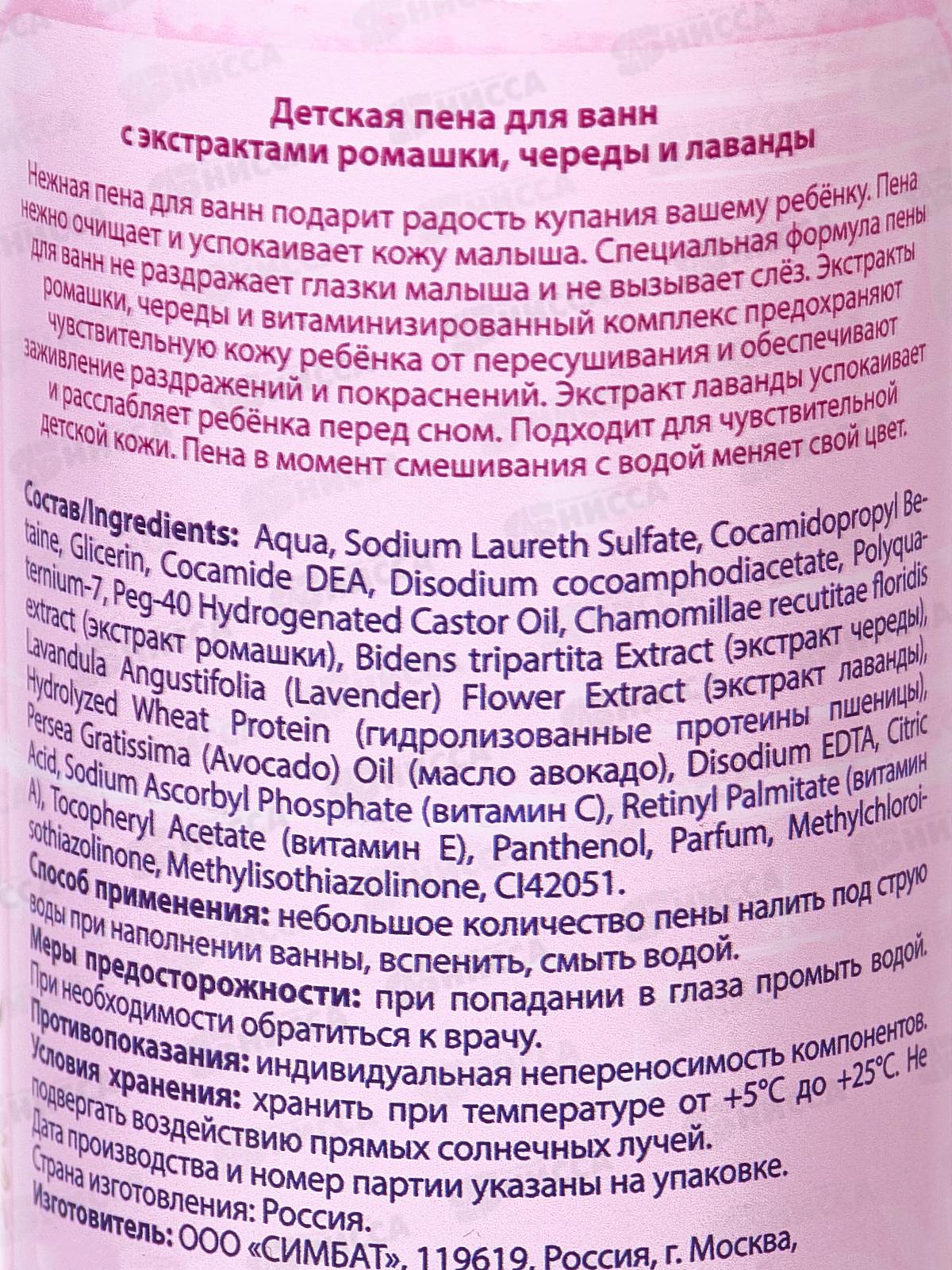 Состав: вода, лауретсульфат натрия, кокамидопропилбетаин, глицерин, кокамид ДЭА, динатрий кокоамфодиацетат, поликватерниум-7, гидрогенизированное касторовое масло Peg-40, экстракт Chamomillae recutitae floridis (Экстракт ромашки), экстракт Bidens tripartita (экстракт череды), экстракт цветков лаванды узколистной (экстракт лаванды), Гидролизованный белок пшеницы (Гидролизованные протеины пшеницы), масло Persea Gratissima (авокадо), динатрий ЭДТА, лимонная кислота, аскорбилфосфат натрия (витамин С), ретинилпальмитат (витамин А), токоферилацетат (витамин Е), пантенол, отдушка, метилхлоризотиазолинон, Метилизотиазолинон, CI42051.