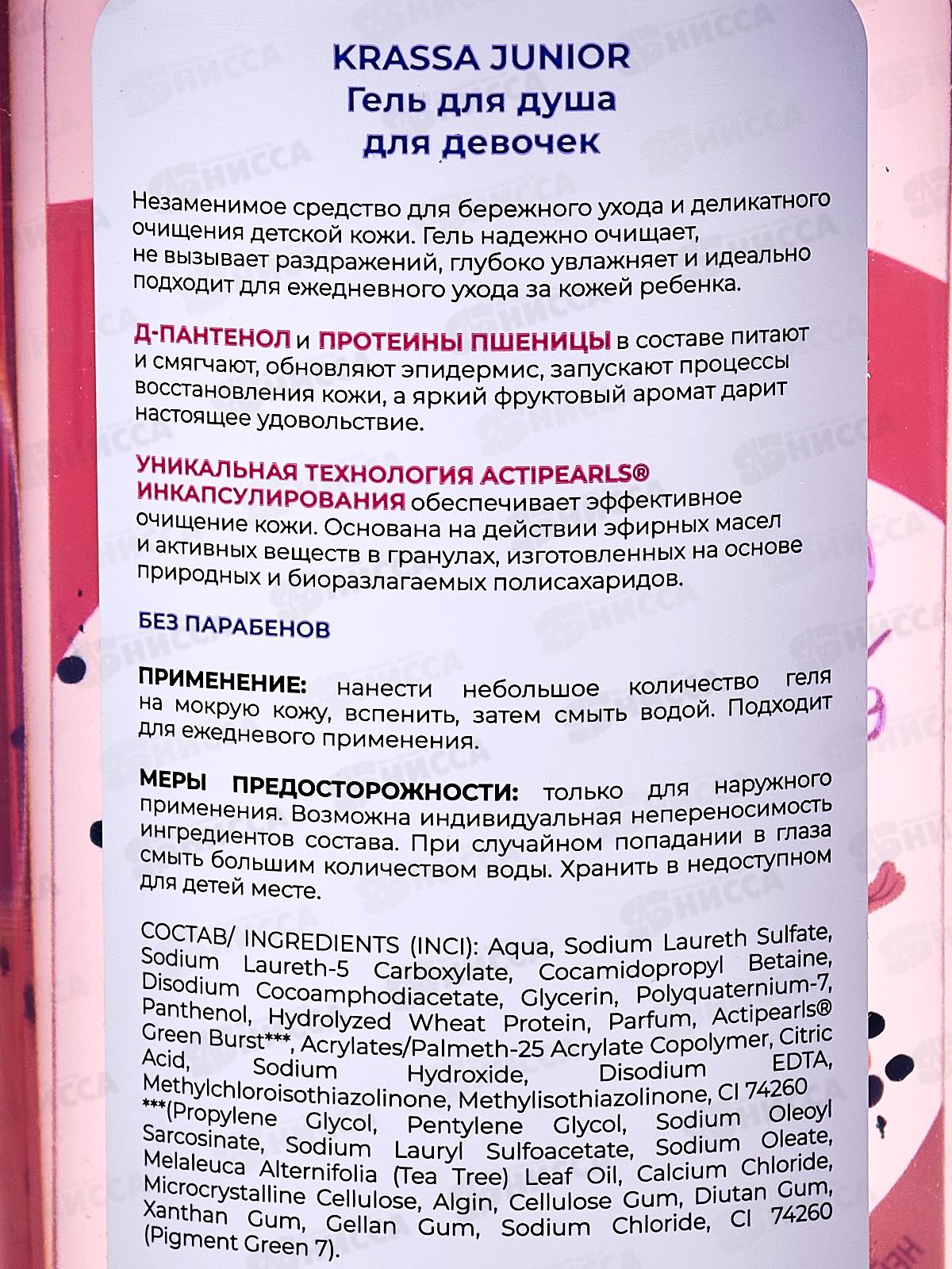 Состав: вода, лауретсульфат натрия, лаурет-5 карбоксилат натрия, кокамидопропилбетаин, динатриевый кокоамфодиацетат, глицерин, поликватерниум-7, пантенол, гидролизованный пшеничный протеин, отдушка, ActipearlsR Green Burst***, сополимер акрилатов/пальмет-25 акрилата, лимонная кислота, гидроксид натрия, динатриевая ЭДТА, метилхлоризотиазолинон, метилизотиазолинон, CI 74260 ***(пропиленгликоль, пентиленгликоль, олеоилсаркозинат натрия, лаурилсульфоацетат натрия, олеат натрия, масло листьев чайного дерева (Melaleuca Alternifolia), хлорид кальция, микрокристаллическая целлюлоза, альгин, целлюлозная камедь, диутан Камедь, ксантановая камедь, геллановая камедь, хлорид натрия, CI 74260 (пигмент зеленый 7).