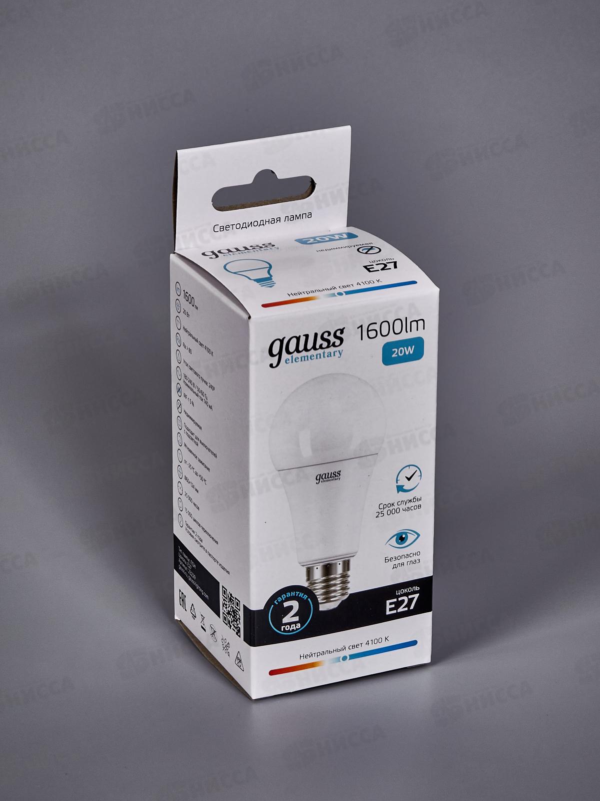 Лампа светодиодная Gauss Elementary A60 20Вт E27 4100К 1600Lm 23229 *50