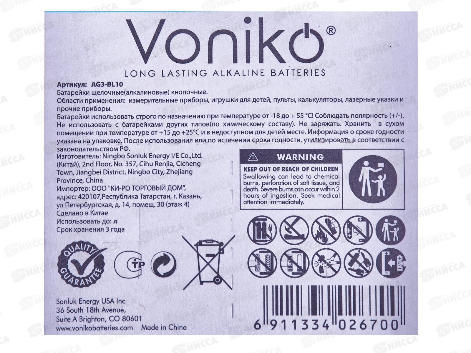 Батарейка VONIKO алкалиновая кнопочная AG3, 1.5В *10/200/3200