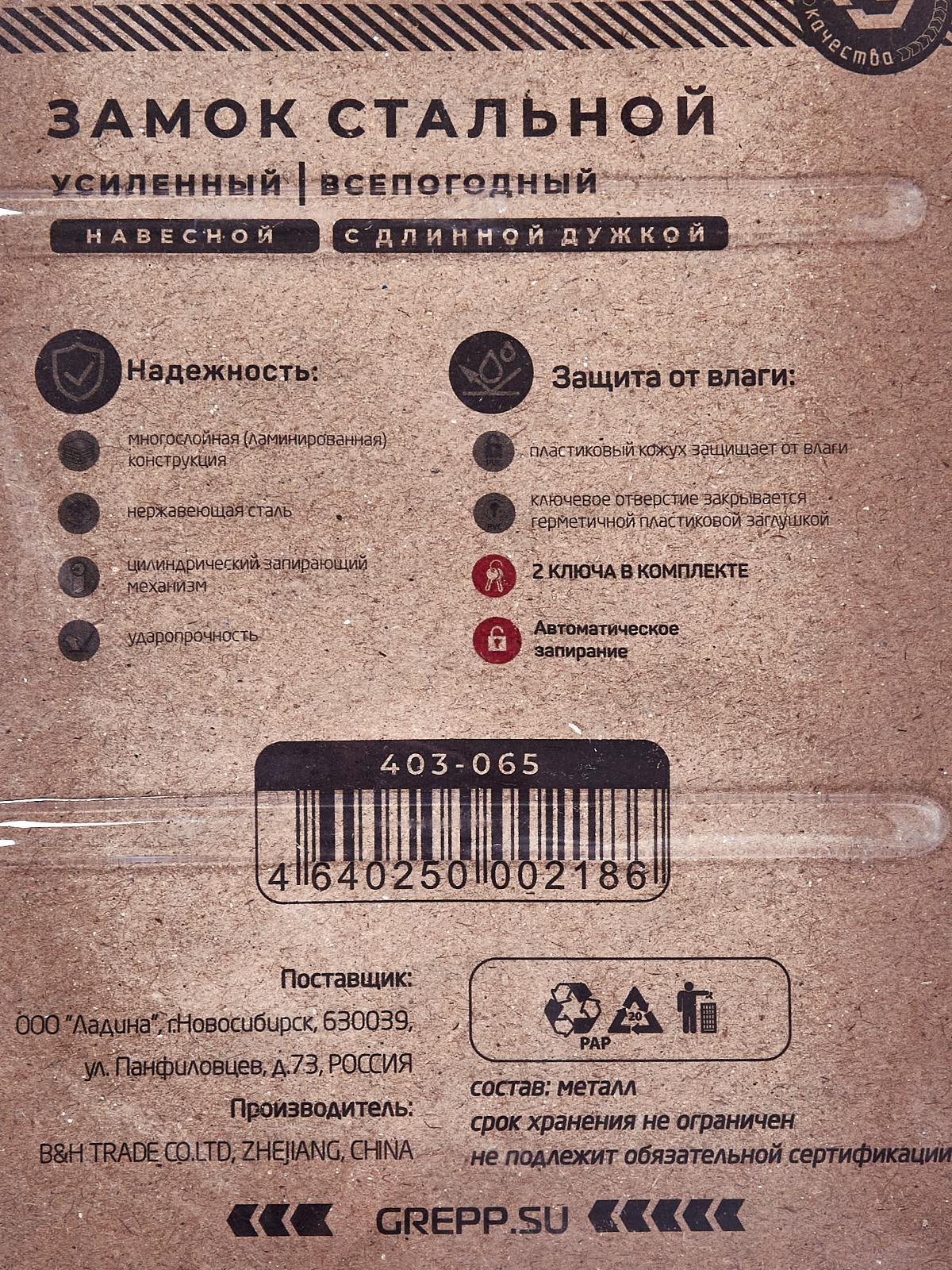 Замок навесной "GREPP" 65мм всепогодный с длинной душкой 403-065 *6/36