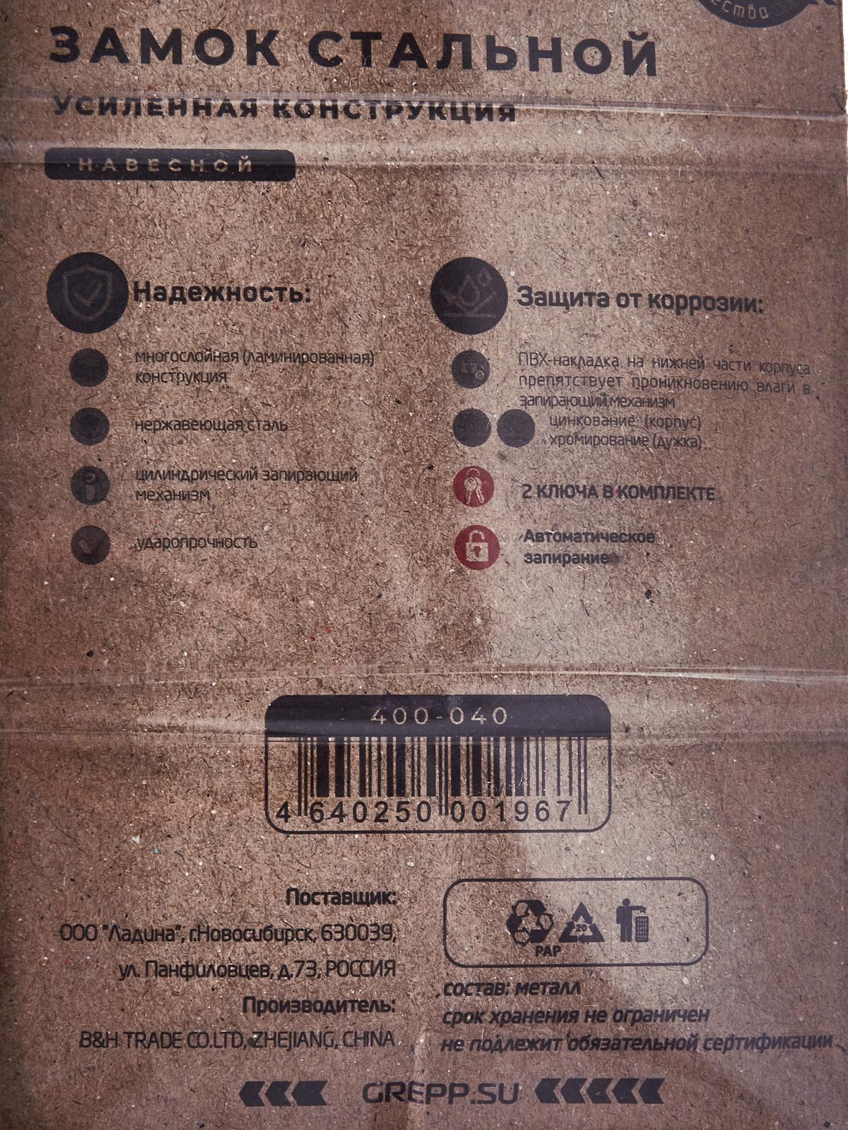 Замок навесной "GREPP" сталь 40мм 400-040 *12/72