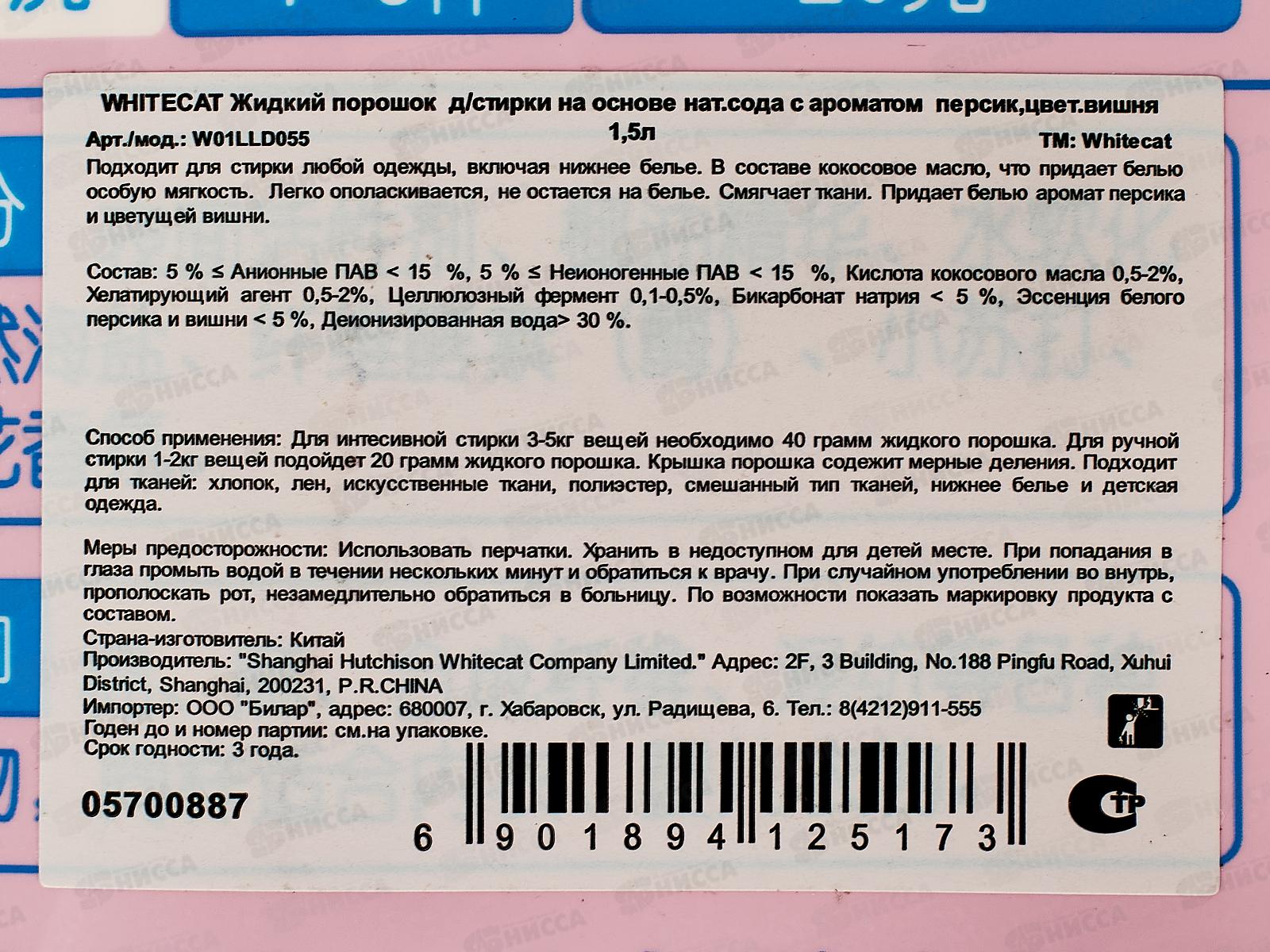 Whitecat Гель для стирки 1,5л на основе соды Персик и вишня дой-пак *6