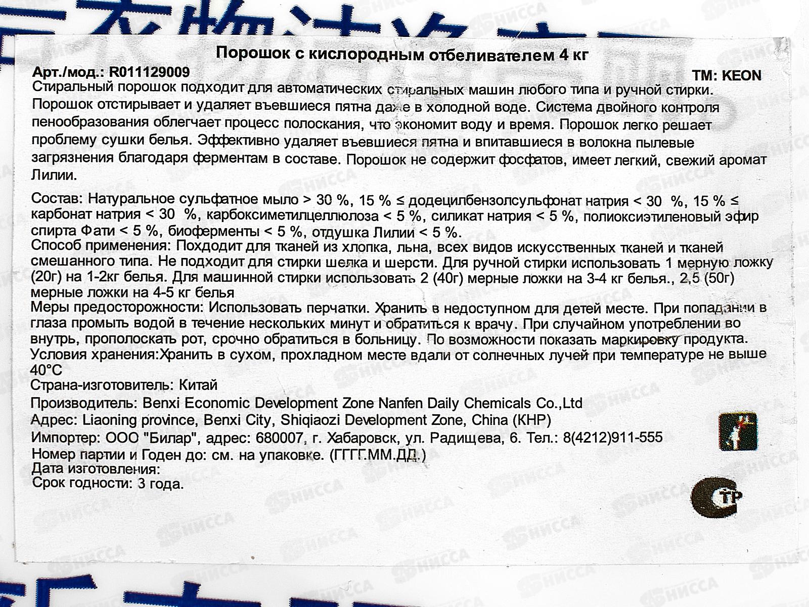Keon порошок для стирки 4кг Кислородный отбеливатель для в/в/б *1