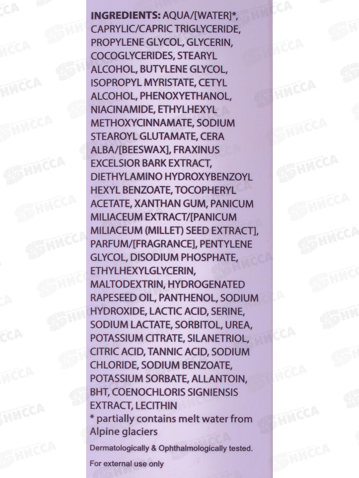 Состав: вода, каприловый/каприновый триглицерид, пропиленгликоль, глицерин, кокоглицериды, стеариловый спирт, бутиленгликоль, изопропилмиристат, цетиловый спирт, феноксиэтанол, ниацинамид, этилгексилметоксициннамат, стеароилглутамат натрия, пчелиный воск (cera alba), экстракт коры ясеня (fraxinus excelsior), диэтиламиногидроксибензоилгексилбензоат, токоферилацетат, ксантановая камедь, экстракт семян проса (panicum miliaceum), парфюмерная композиция (parfum), пентилен гликоль, динатрийфосфат, этилгексилглицерин, мальтодекстрин, гидрогенизированное рапсовое масло, пантенол, гидроксид натрия, молочная кислота, серин, лактат натрия, сорбит, мочевина, цитрат калия, силантриол, лимонная кислота, дубильная кислота, хлорид натрия, бензоат натрия, сорбат калия, аллантоин, bht, экстракт ценохлориса сигниенсис, лецитин.