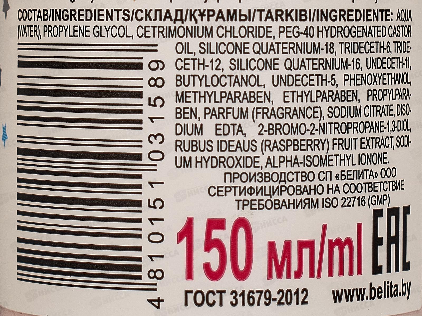 Спрей с нежным ароматом ягод и тропических фруктов предотвращает спутывание волос и облегчает расчесывание. Кондиционирующие добавки придают гладкость волосам, обеспечивают легкое расчесывание без спутывания волос, не утяжеляет волосы. Натуральный экстракт малины придает прочность локонам. Подходит даже для длинных волос. Состав: вода, пропиленгликоль, хлорид цетримония, ПЭГ-40 гидрогенизированное касторовое масло, силикон кватерниум-18, тридецет-6, тридецет-12, силикон кватерниум-16, ундецет-11, бутилоктанол, ундецет-5, феноксиэтанол, метилпарабен, этилпарабен, пропилпарабен, парфюмерная композиция, ЭДТА динатрия, 2-бром-2-нитропропан-1,3-диол, экстракт плодов Rubus Idaeus (малины), альфа-изометилионон.