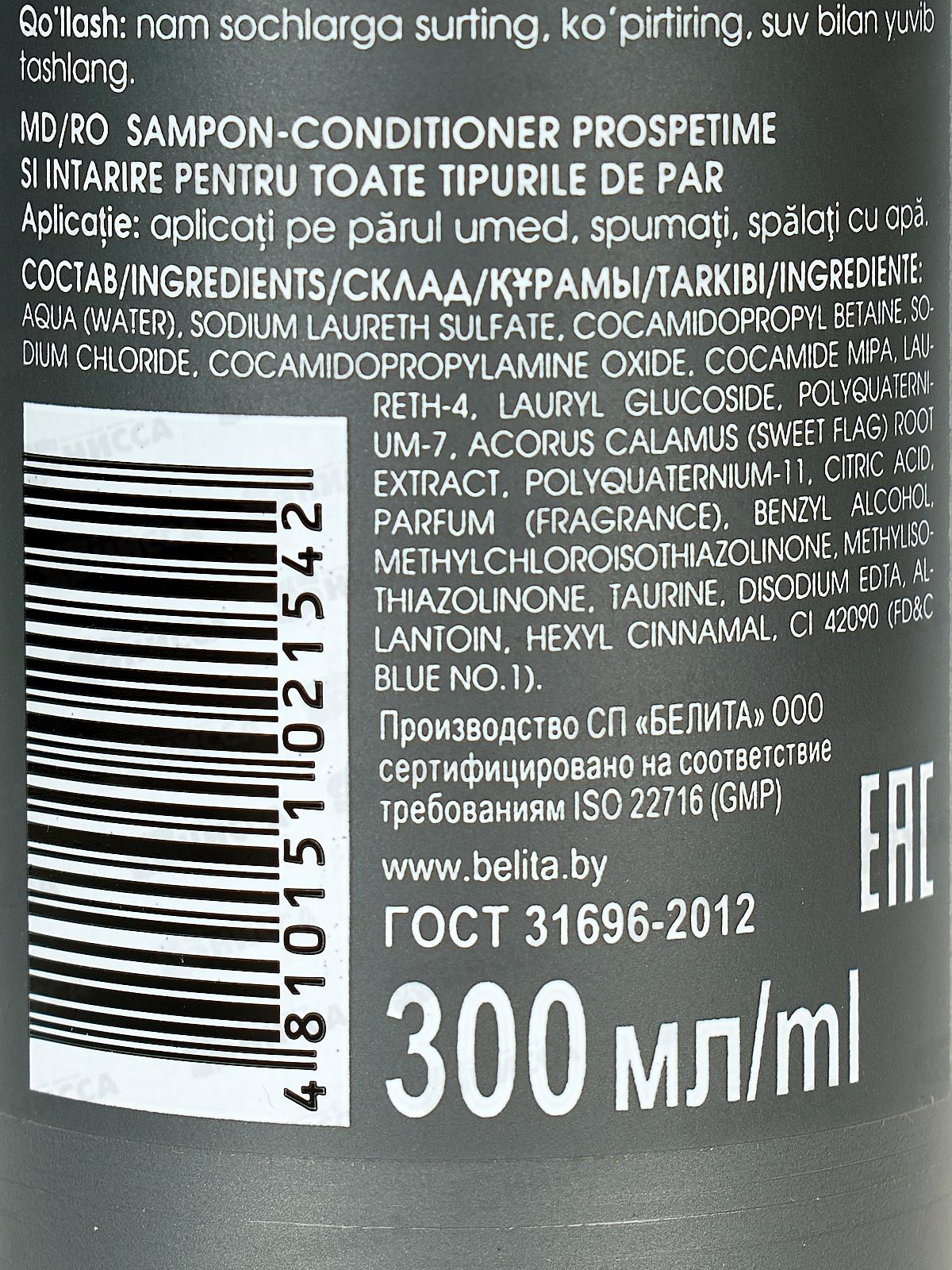 Шампунь-кондиционер бережно очищает волосы и кожу головы, не пересушивая их. Придает волосам блеск и гладкость, укрепляет, делает их послушными. Состав: вода, лауретсульфат натрия, кокамидопропилбетаин, кокамидопропиламиноксид, хлорид натрия, кокамид MIPA, лаурет-4, лаурилглюкозид, кокамидопропилбетаин, поликватерниум-7, экстракт Acorus Calamus (аира), поликватерниум-11, парфюмерная композиция, кислота лимонная, бензиловый спирт, метилхлоризотиазолинон, метилизотиазолинон, таурин, ЭДТА динатрия, аллантоин, CI 42090, гексилциннамаль.