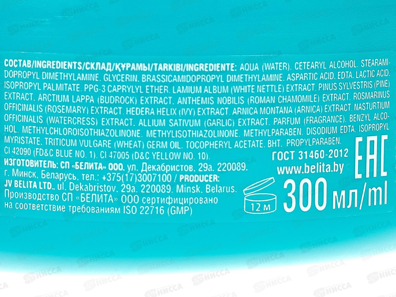 Продукт создан для активного кондиционирования жирных и склонных к жирности волос с приданием волосам головокружительного объема без их утяжеления. Состав: вода, цетеариловый спирт, стеарамидопропилдиметиламин, глицерин, цетеариловый спирт, брассикамидопропилдиметиламин, аспаргиновая кислота, ЭДТА, молочная кислота, изопропилпальмитат, ППГ-3 каприлиловый эфир, парфюмерная композиция, экстракт белой крапивы, сосны, лопуха, ромашки, розмарина, плюща, арники, водяного креса, чеснока, бензиловый спирт, метилхлоризотиазолинон, метилизотиазолинон, метилпарабен, ЭДТА динатрия, изопропилмиристат, масло зародышей Triticum vulgare (пшеницы), токоферилацетат, БГТ, пропилпарабен, краситель зелёный.