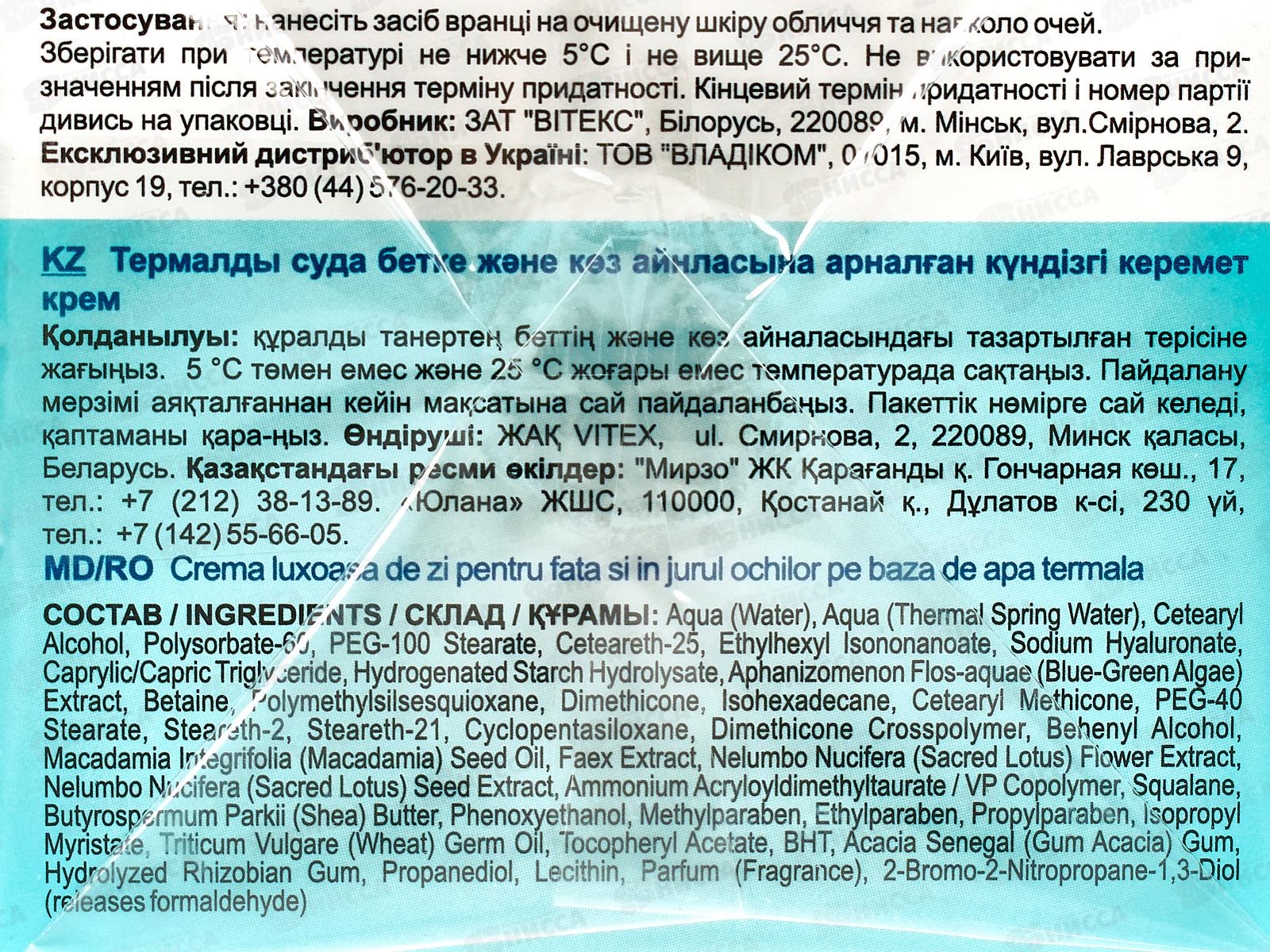Восхитительно роскошный дневной крем на термальной воде с микросферами голубого ретинола для лица и кожи вокруг глаз, с бархатистой текстурой для интенсивного питания, увлажнения и разглаживания кожи, с эффектом мгновенного лифтинга. Состав: Вода, термальная вода, цетеариловый спирт, полисорбат-60, ПЭГ-100 стеарат, цетеарет-25, этилгексилизононаноат, гиалуронат натрия, глицерилтрикаприлат/капрат, гидрогенизированный гидролизат крахмала, экстракт Aphanizomenon Flos-aquae (сине-зеленых водорослей), бетаин, полиметилсилсесквиоксан, диметикон, изогексадекан, цетеарилметикон, ПЭГ-40 стеарат, стеарет-2, стеарет-21, циклопентасилоксан, кроссполимер диметикона, бегениловый спирт, масло семян Macadamia Integrifolia (макадамии), экстракт пивных дрожжей, экстракт цветов Nelumbo Nucifera (лотоса), экстракт семян Nelumbo Nucifera (лотоса), сополимер акрилоилдиметилтаурата аммония и винилпирролидона, сквалан, масло Butyrospermum parkii (ши), феноксиэтанол, метилпарабен, этилпарабен, пропилпарабен, изопропилмиристат, масло зародышей Triticum vulgare (пшеницы), токоферилацетат, БГТ, камедь Acacia Senegal (сенегальской акации), гидролизованная ризобиевая камедь, пропандиол, лецитин, парфюмерная композиция, 2-бром-2-нитропропан-1,3-диол.