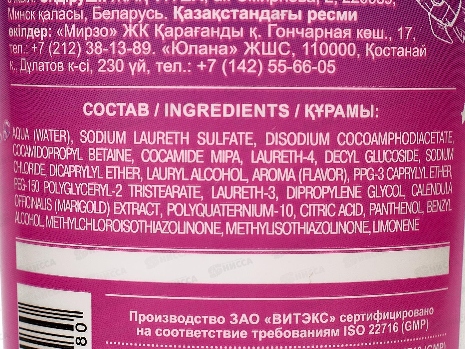 Средство увлажняет, питает и разглаживает волосы, укрепляет, уплотняет и распутывает их, облегчает расчёсывание и укладку, делает пряди мягкими, упругими, шелковистыми и эластичными. Состав: вода, лауретсульфат натрия, кокоамфодиацетат динатрия, кокамидопропилбетаин, кокамид MIPA, лаурет-4, децилглюкозид, хлорид натрия, дикаприлиловый эфир, лауриловый спирт, ароматизатор, ПЭГ-150 полиглицерил-2 тристеарат, лаурет-3, дипропиленгликоль, экстракт Calendula Officinalis (календулы), поликватерниум-10, лимонная кислота, пантенол, бензиловый спирт, метилхлоризотиазолинон, метилизотиазолинон, лимонен.