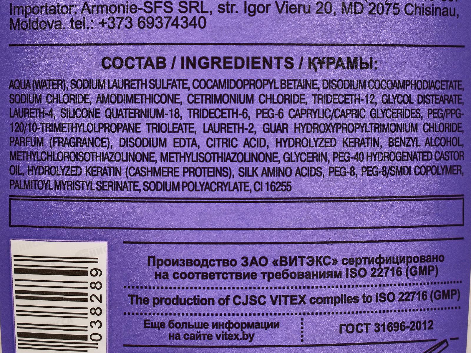Шампунь-филлер создан на основе революционной технологии ANTI-BREAKING, направленной на «ремонт» поврежденных участков в структуре волос и защиту от негативных факторов, провоцирующих ломкость и ослабление локонов. Состав: вода, лауретсульфат натрия, кокамидопропилбетаин, кокоамфодиацетат динатрия, хлорид натрия, амодиметикон, хлорид цетримония, тридецет-12, гликольдистеарат, лаурет-4, силикон кватерниум-18, тридецет-6, ПЭГ-6 глицерилкаприлат/капрат, триолеат ПЭГ/ППГ-120/10-триметилпропана, лаурет-2, хлорид гидроксипропилтримония гуара, парфюмерная композиция, ЭДТА динатрия, лимонная кислота, гидролизованный кератин (протеины кашемира), бензиловый спирт, метилхлоризотиазолинон, метилизотиазолинон, глицерин, ПЭГ-40 гидрогенизированное касторовое масло, гидролизованный кератин (протеины кашемира), аминокислоты шелка, глицерин, ПЭГ-8, сополимер ПЭГ-8 / СМДИ, пальмитоилмиристилсиринат, полиакрилат натрия, CI 16255.