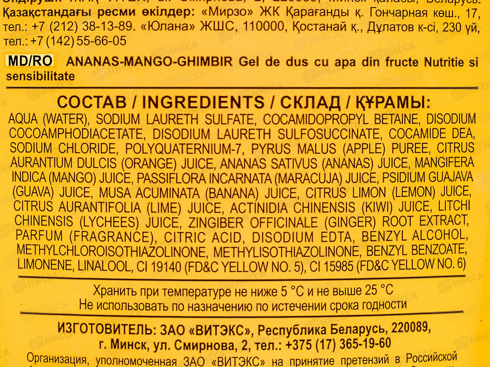 Отлично очищает кожу без раздражения и пересушивания. Обладает изумительно вкусным ароматом. Прекрасно пенится и легко смывается. Гель для душа Spicy FRUIT на 98% состоит из натуральных компонентов, благодаря чему не только бережно очищает кожу, но и одновременно ухаживает за ней. Состав: вода, лауретсульфат натрия, кокамидопропилбетаин, кокоамфодиацетат динатрия, лауретсульфосукцинат натрия, кокамид ДЭА, хлорид натрия, поликватерниум-7, яблочное пюре, сок апельсиновый, сок ананасовый, сок манго, сок пассифлоры, сок гуавы, сок банана, сок лимона, сок лайма, сок киви, сок личи,, экстракт корня Zingiber Officinale (имбиря), парфюмерная композиция, лимонная кислота, ЭДТА динатрия, бензиловый спирт, метилхлоризотиазолинон, метилизотиазолинон, бензилбензоат, лимонен, линалол, CI 19140, CI 15985.