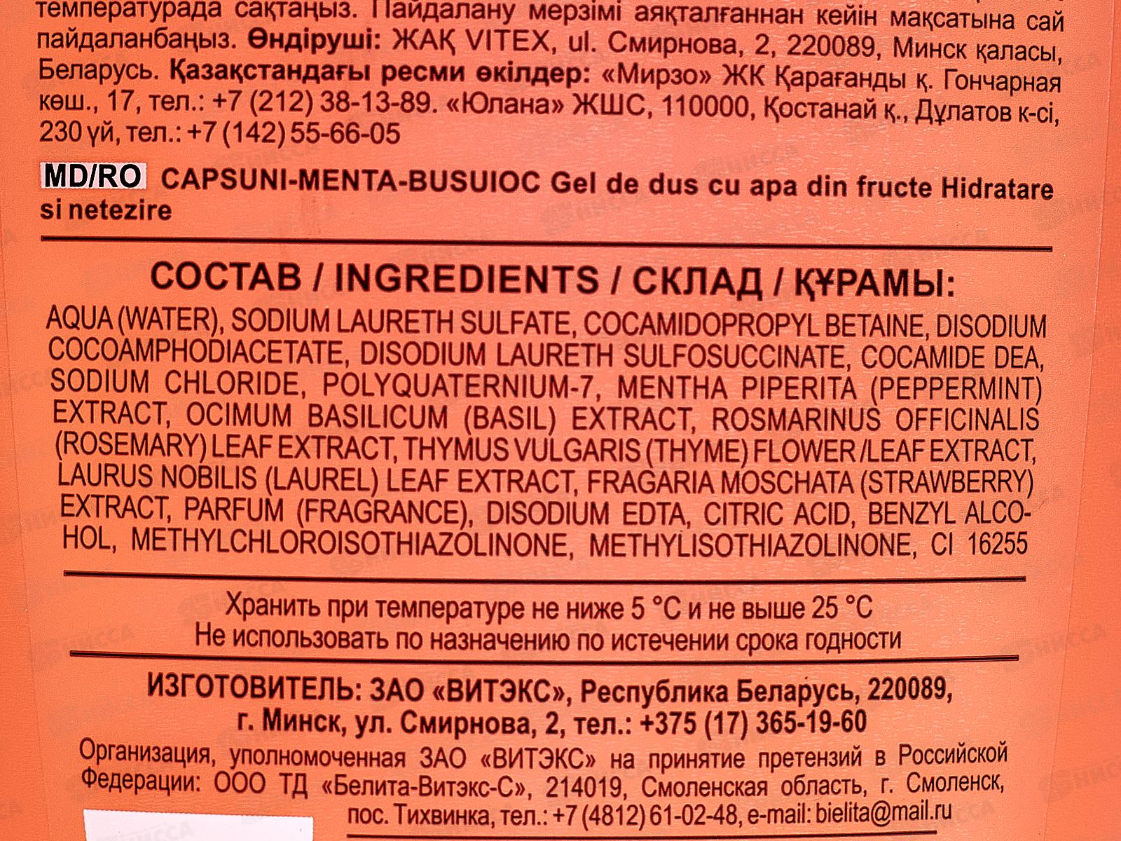 Отлично очищает кожу без раздражения и пересушивания. Обладает изумительно вкусным ароматом. Прекрасно пенится и легко смывается. Состав: вода, лауретсульфат натрия, кокамидопропилбетаин, кокоамфодиацетат динатрия, лауретсульфосукцинат натрия, кокамид ДЭА, хлорид натрия, поликватерниум-7, экстракт Mentha Piperita (мяты), экстракт Ocimum basilicum (базилика), экстракт листьев Rosmarinus officinalis (розмарина), экстракт цветов/листьев Thymus vulgaris (тимьяна), экстракт листьев Laurus nobilis (лавра), экстракт плодов Fragaria Moschata (клубники), парфюмерная композиция, ЭДТА динатрия, лимонная кислота, бензиловый спирт, метилхлоризотиазолинон, метилизотиазолинон, CI 16255.