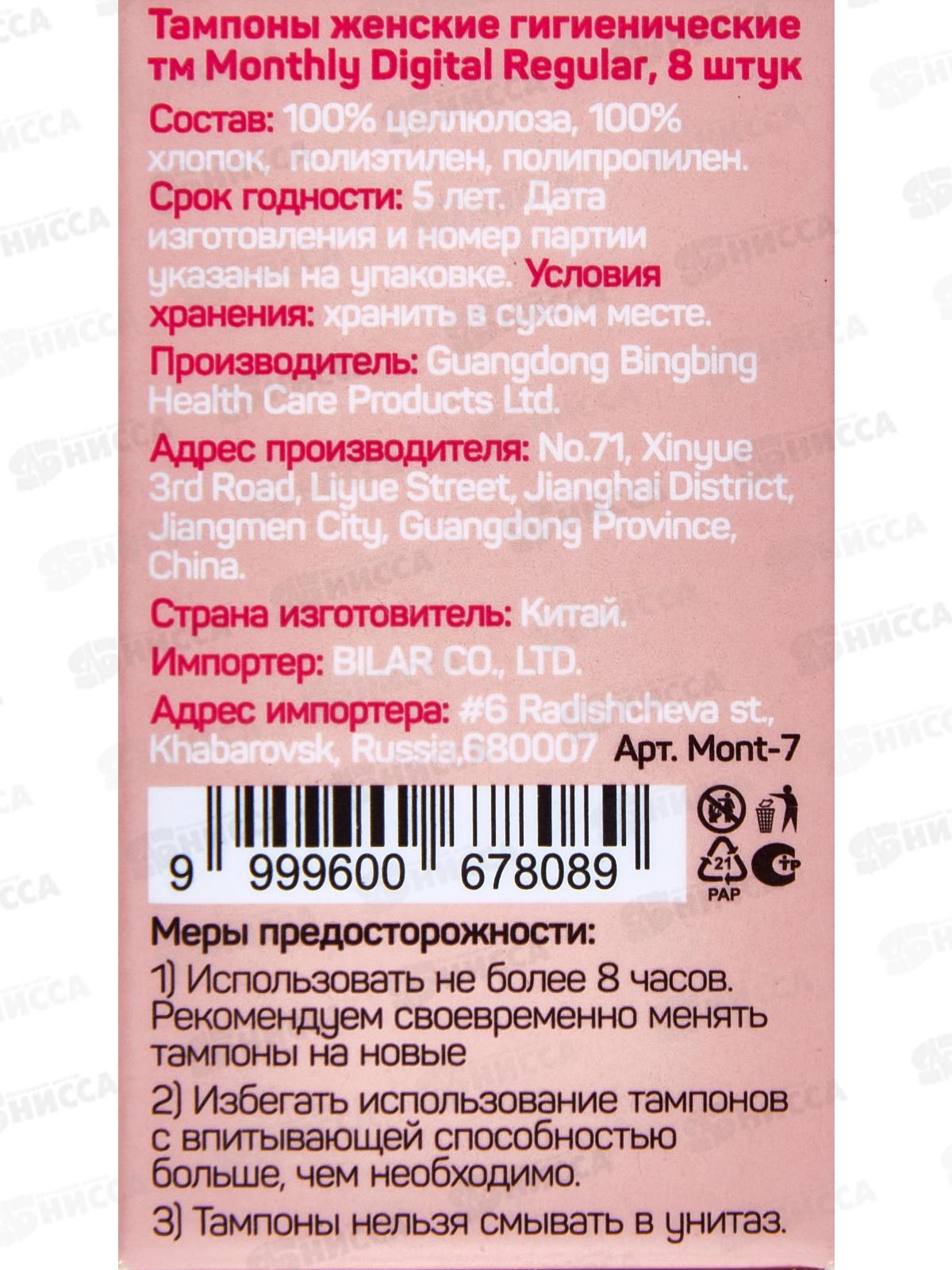 Тампоны Monthly не сковывают движение при использовании, даже в критические дни вы можете заниматься любимым видом спорта. При использовании тампона вы получаете возможность свободно плавать и не переживать о гигиене. У тампона мягкий закруглённый кончик покрытый специальным покрытием для лёгкого введения. Тампоны абсолютно безопасны для здоровья, не содержат хлор, ароматизаторы и синтетические красители. Хлопковый шнур надёжно зафиксирован внутри тампона, что обеспечивает лёгкое и безопасное извлечение тампона. Состав: 100% целлюлоза, 100% хлопок, полиэтилен, полипропилен.