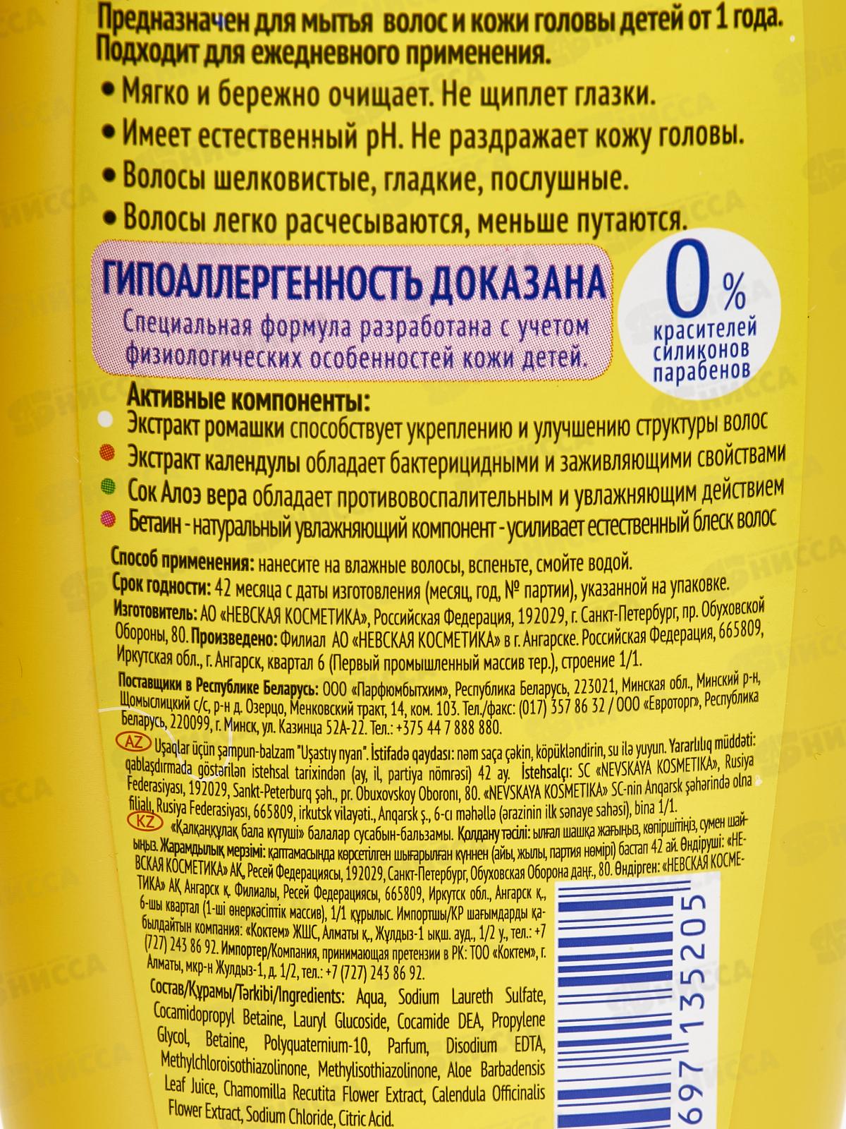 Состав: вода, Лауретсульфат натрия, Кокамидопропилбетаин, Лаурилглюкозид, Кокамид ДЭА, Пропиленгликоль, Бетаин, Поликватерниум-10, Парфюмерная композиция, Динатрий ЭДТА, Метилхлоризотиазолинон, Метилизотиазолинон, Сок листьев алоэ вера, Экстракт цветков ромашки аптечной, Экстракт цветков календулы лекарственной, Хлорид натрия, Лимонная кислота.