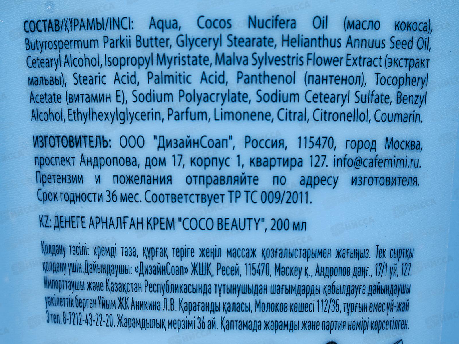 Состав: вода, масло Cocos Nucifera (масло кокоса), масло Butyrospermum Parkii, глицерилстеарат, масло семян Helianthus Annuus, цетеариловый спирт, изопропилмиристат, экстракт цветов мальвы сильвестрис (экстракт мальвы), стеариновая кислота, пальмитиновая кислота, пантенол (пантенол), токоферилацетат (витамин Е), полиакрилат натрия, Цетеарилсульфат натрия, бензиловый спирт, этилгексилглицерин, отдушка, лимонен, цитраль, цитронеллол, кумарин.