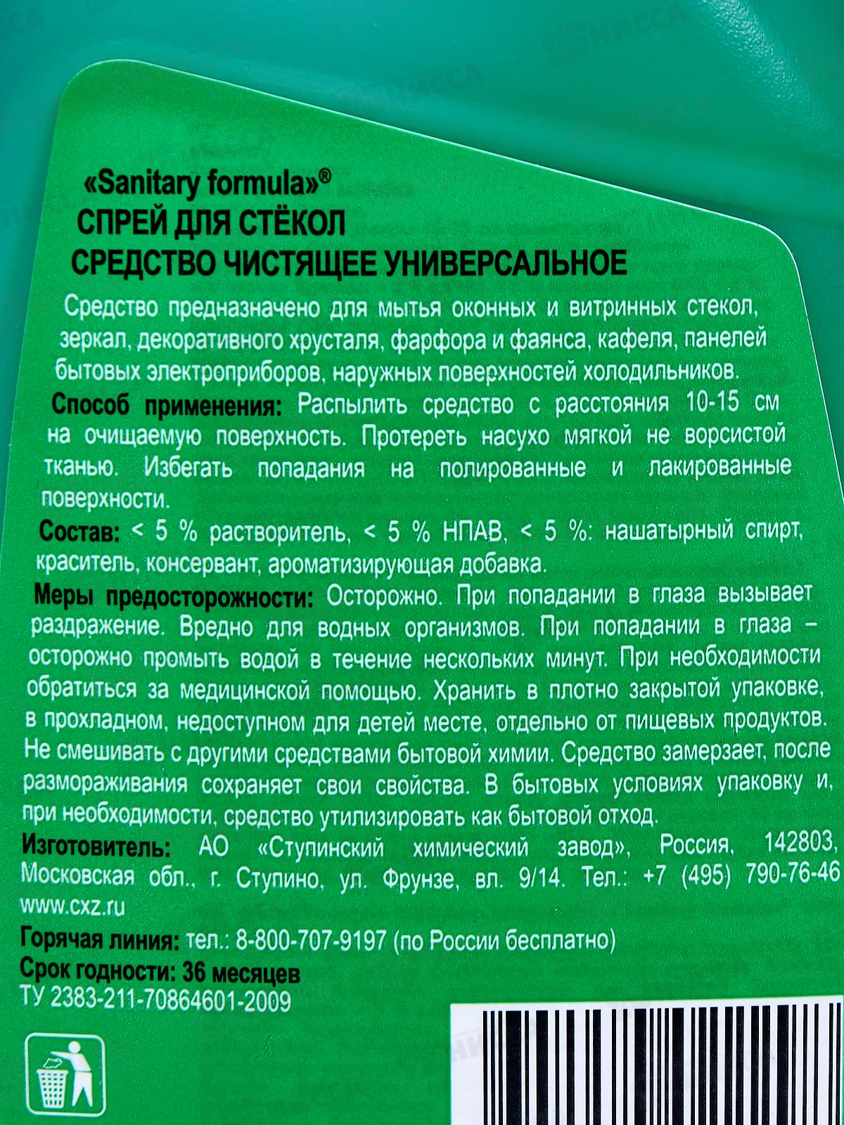 Состав: < 5 % растворитель, < 5 % НПАВ. < 5 %: нашатырный спирт, краситель, консервант, ароматизирующая добавка.