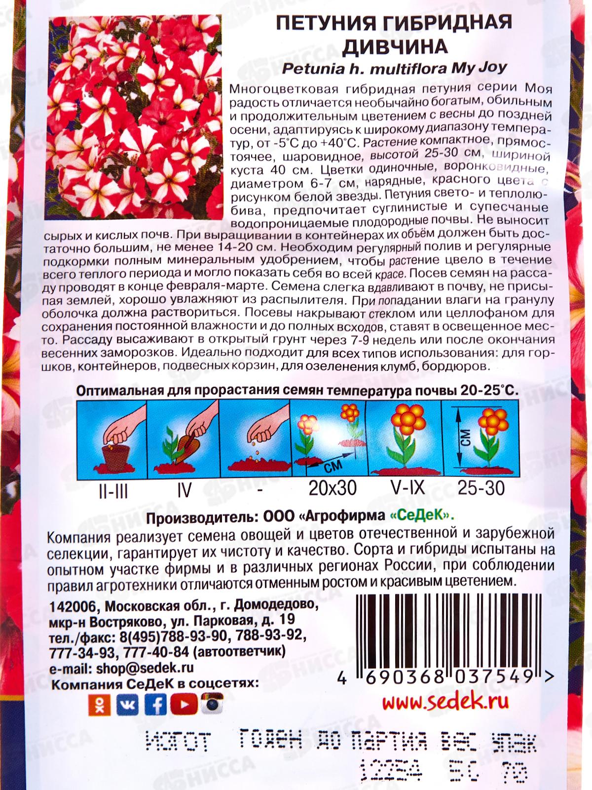 Многоцветковая гибридная петуния серии Моя радость отличается необычайно богатым, обильным и продолжительным цветением с весны до поздней осени, адаптируясь к широкому диапазону температур, от -5C до +40C. Растение компактное, прямостоячее, шаровидное, высотой 25-30 см, шириной куста 40 см. Цветки одиночные, воронковидные, диаметром 6-7 см, нарядные, красного цвета с рисунком белой звезды. Петуния свето- и теплолюбива, предпочитает суглинистые и супесчаные водопроницаемые плодородные почвы. Не выносит сырых и кислых почв. При выращивании в контейнерах их объём должен быть достаточно большим, не менее 14-20 см. Необходим регулярный полив и регулярные подкормки полным минеральным удобрением, чтобы растение цвело в течение всего теплого периода и могло показать себя во всей красе. Посев семян на рассаду проводят в конце февраля-марте. Семена слегка вдавливают в почву, не присыпая землей, хорошо увлажняют из распылителя. При попадании влаги на гранулу оболочка должна раствориться. Посевы накрывают стеклом или целлофаном для сохранения постоянной влажности и до полных всходов, ставят в освещенное место. Рассаду высаживают в открытый грунт через 7-9 недель или после окончания весенних заморозков. Идеально подходит для всех типов использования: для горшков, контейнеров, подвесных корзин, для озеленения клумб, бордюров.