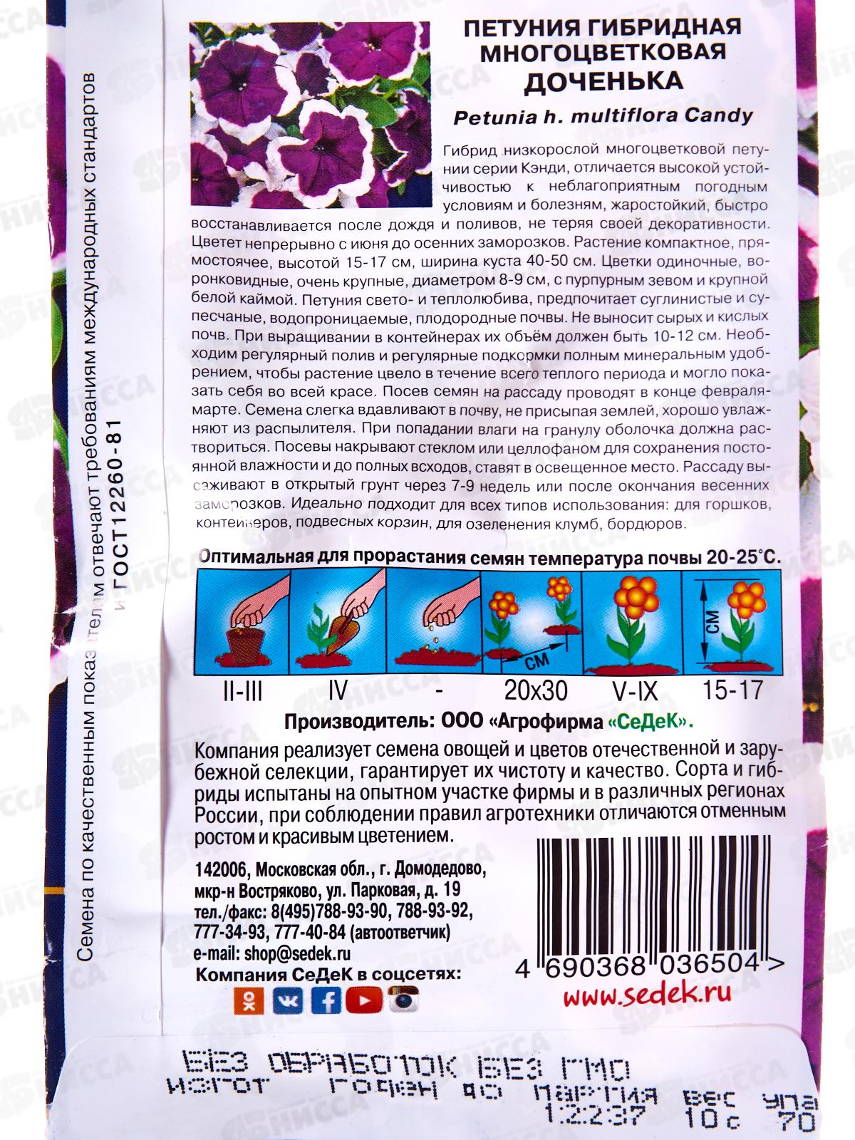 Гибрид низкорослой многоцветковой петунии серии Кэнди, отличается высокой устойчивостью к неблагоприятным погодным условиям и болезням, жаростойкий, быстро восстанавливается после дождя и поливов, не теряя своей декоративности. Цветет непрерывно с июня до осенних заморозков. Растение компактное, прямостоячее, высотой 15-17 см, ширина куста 40-50 см. Цветки одиночные, воронковидные, очень крупные, диаметром 8-9 см, с пурпурным зевом и крупной белой каймой. Петуния свето- и теплолюбива, предпочитает суглинистые и супесчаные, водопроницаемые, плодородные почвы. Не выносит сырых и кислых почв. При выращивании в контейнерах их объём должен быть 10-12 см. Необходим регулярный полив и регулярные подкормки полным минеральным удобрением, чтобы растение цвело в течение всего теплого периода и могло показать себя во всей красе. Посев семян на рассаду проводят в конце Февраля-Марте. Семена слегка вдавливают в почву, не присыпая землей, хорошо увлажняют из распылителя. При попадании влаги на гранулу оболочка должна раствориться. Посевы накрывают стеклом или целлофаном для сохранения постоянной влажности и до полных всходов, ставят в освещенное место. Рассаду высаживают в открытый грунт через 7-9 недель или после окончания весенних заморозков. Идеально подходит для всех типов использования: для горшков, контейнеров, подвесных корзин, для озеленения клумб, бордюров. Оптимальная для прорастания семян температура почвы 20-25? С.