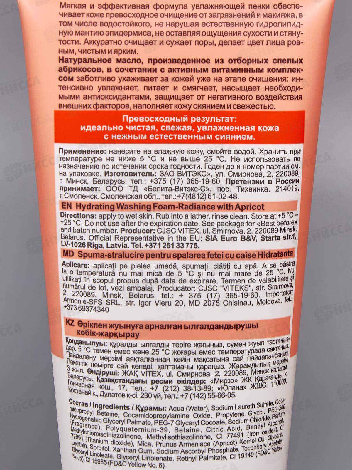 Мягкая и эффективная формула увлажняющей пенки обеспечивает коже превосходное очищение от загрязнений и макияжа, в том числе водостойкого, не нарушая естественную гидролипидную мантию эпидермиса, не оставляя ощущения сухости и стянутости. Аккуратно очищает и сужает поры, делает цвет лица ровным, чистым и ярким. Состав: Вода, лауретсульфат натрия, кокамидопропилбетаин, кокамидопропиламиноксид, пропиленгликоль, пэг-200 гидрогенизированный глицерилпальмат, пэг-7 глицерилкокоат, хлорид натрия, парфюмерная композиция, поликватерниум-39, бетаин, лимонная кислота, бензиловый спирт, метилхлоризотиазолинон, метилизотиазолинон, ci 77491 (оксиды железа), ci 77891 (диоксид титана), слюда, масло косточек prunus armeniaca (абрикоса), глицерин, лецитин, сорбитол, ксантановая камедь, аскорбилфосфат натрия, токоферилацетат, глицериллинолеат, глицериллиноленат, ретинилпальмитат, ci 19140, ci 15985.