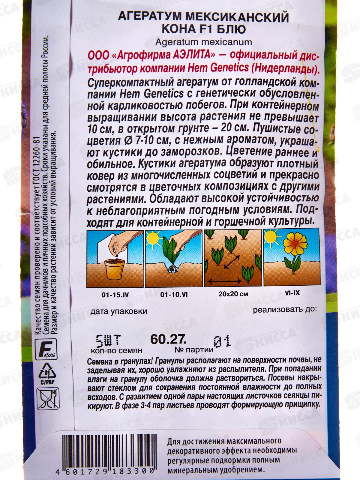 Суперкомпактный однолетний агератум от голландской компании Hem Genetics с генетически обусловленной карликовостью побегов. При контейнерном выращивании высота растения не превышает 10 см, в открытом грунте – 20 см. Ароматные пушистые соцветия диаметром 7-10 см украшают кустики до заморозков. Цветение раннее и обильное. Кустики агератума образуют плотный ковер из многочисленных соцветий и прекрасно смотрятся в цветочных композициях с другими растениями. Обладают высокой устойчивостью к неблагоприятным погодным условиям. Подходят для контейнерной и горшечной культуры. Семена в гранулах! Гранулы располагают на поверхности почвы, не заделывая их, хорошо увлажняют из распылителя. При попадании влаги на гранулу оболочка должна раствориться. Посевы накрывают стеклом для сохранения постоянной влажности до полных всходов. С развитием одной пары настоящих листочков сеянцы пикируют. В фазе 3-4 пар листьев проводят формирующую прищипку.