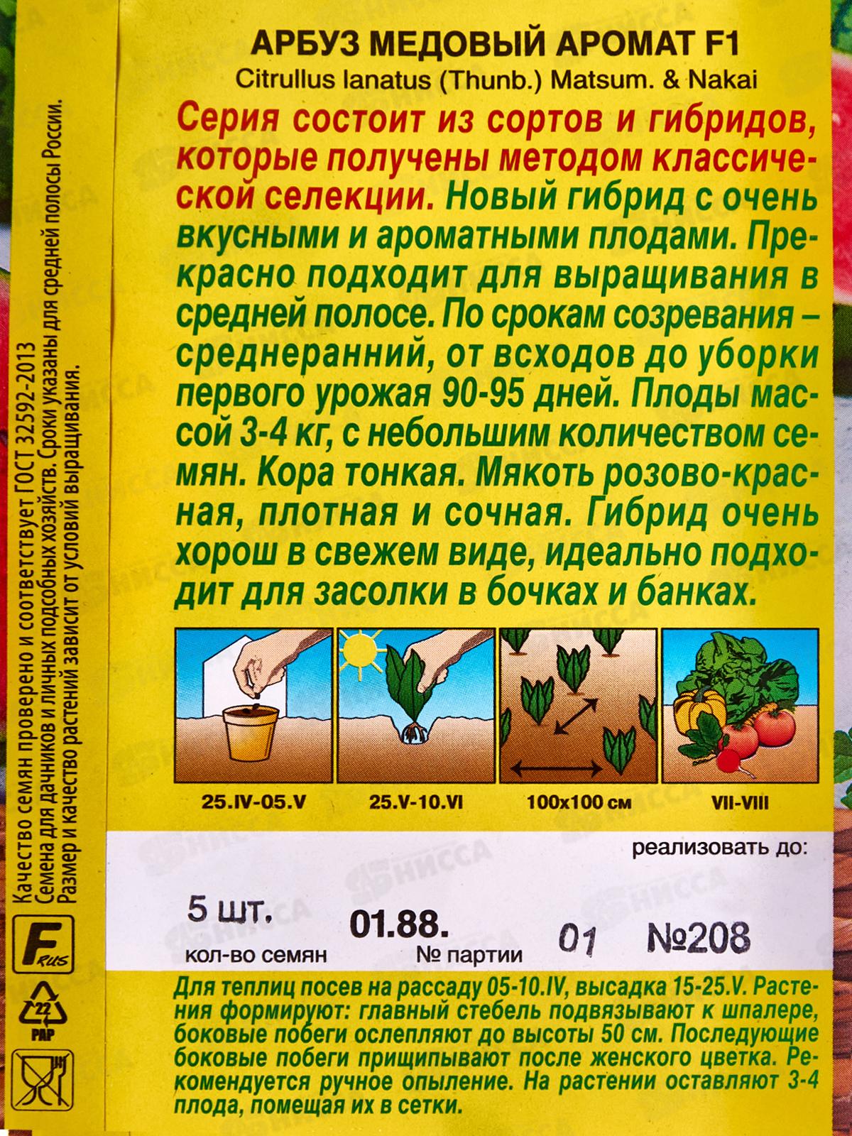 По срокам созревания – среднеранний, от всходов до уборки первого урожая 90-95 дней. Плоды массой 3-4 кг, с небольшим количеством семян. Кора тонкая. Мякоть розово-красная, плотная и сочная. Гибрид очень хорош в свежем виде, идеально подходит для засолки в бочках и банках. Для теплиц посев на рассаду 05-10.IV, высадка 15-25.V. Растения формируют: главный стебель подвязывают к шпалере, боковые побеги ослепляют до высоты 50 см. Последующие боковые побеги прищипывают после женского цветка. Рекомендуется ручное опыление. На растении оставляют 3-4 плода, помещая их в сетки.