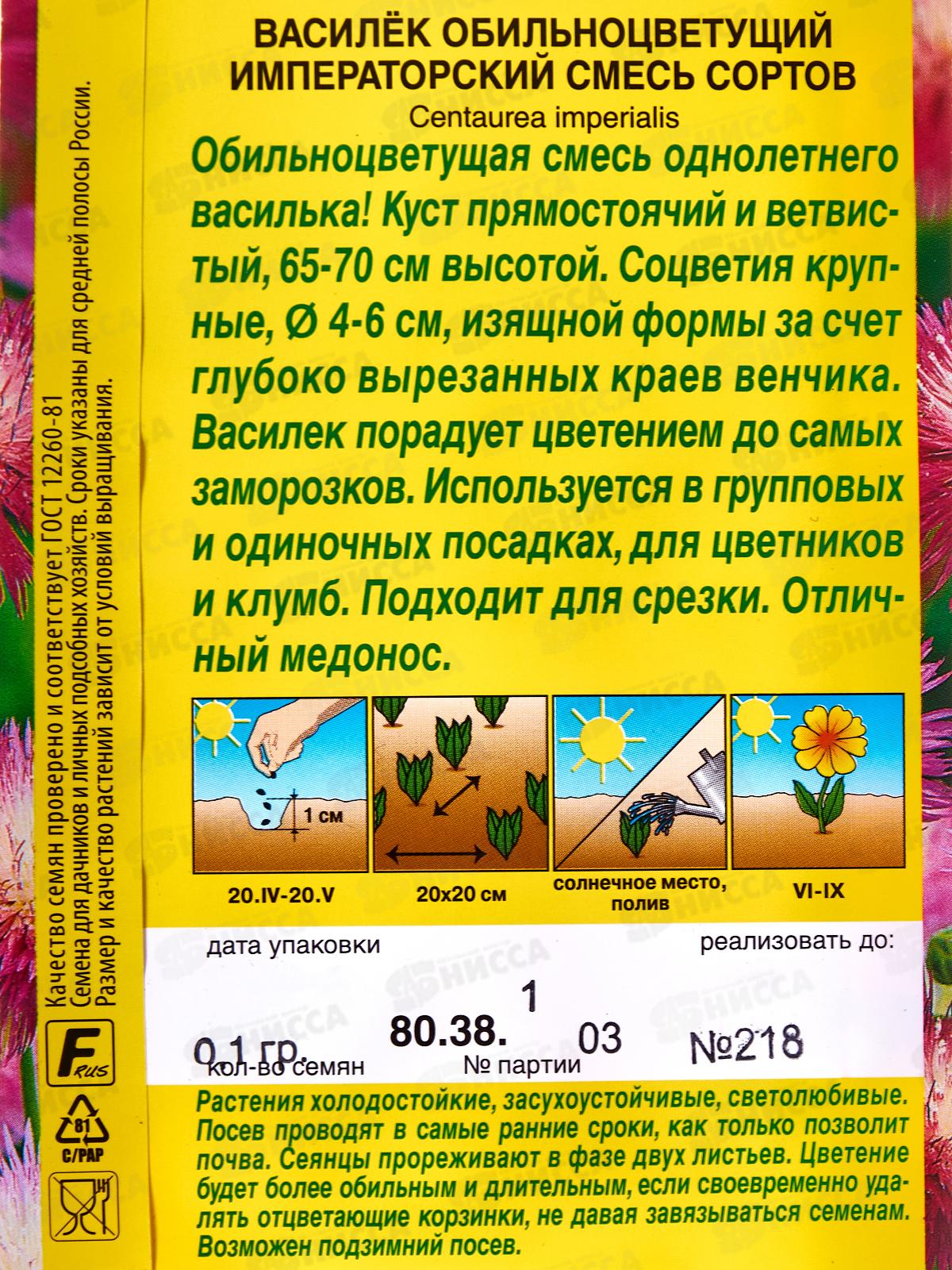 Обильноцветущая смесь однолетнего василька! Куст прямостоячий и ветвистый, 65-70 см высотой. Соцветия крупные, диаметром 4-6 см, изящной формы за счет глубоко вырезанных краев венчика. Василек порадует цветением до самых заморозков. Используется в групповых и одиночных посадках, для цветников и клумб. Подходит для срезки. Отличный медонос. Растения холодостойкие, засухоустойчивые, светолюбивые. Посев проводят в самые ранние сроки, как только позволит почва. Сеянцы прореживают в фазе двух листьев. Цветение будет более обильным и длительным, если своевременно удалять отцветающие корзинки, не давая завязываться семенам. Возможен подзимний посев.