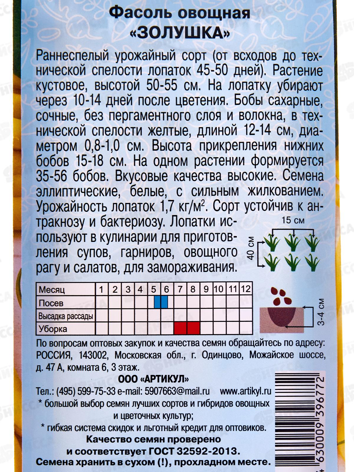 Раннеспелый урожайный сорт (от всходов до технической спелости лопаток 45-50 дней). Растение кустовое, высотой 50-55 см. На лопатку убирают через 10-14 дней после цветения. Бобы сахарные, сочные, без пергаментного слоя и волокна, в технической спелости желтые, длиной 12-14 см, диаметром 0,8-1,0 см. Высота прикрепления нижних бобов 15-18 см. На одном растении формируется 35-56 бобов. Вкусовые качества высокие. Семена эллиптические, белые, с сильным жилкованием. Урожайность лопаток 1,7 кг/м2. Сорт устойчив к антракнозу и бактериозу. Лопатки используют в кулинарии для приготовления супов, гарниров, овощного рагу и салатов, для замораживания.